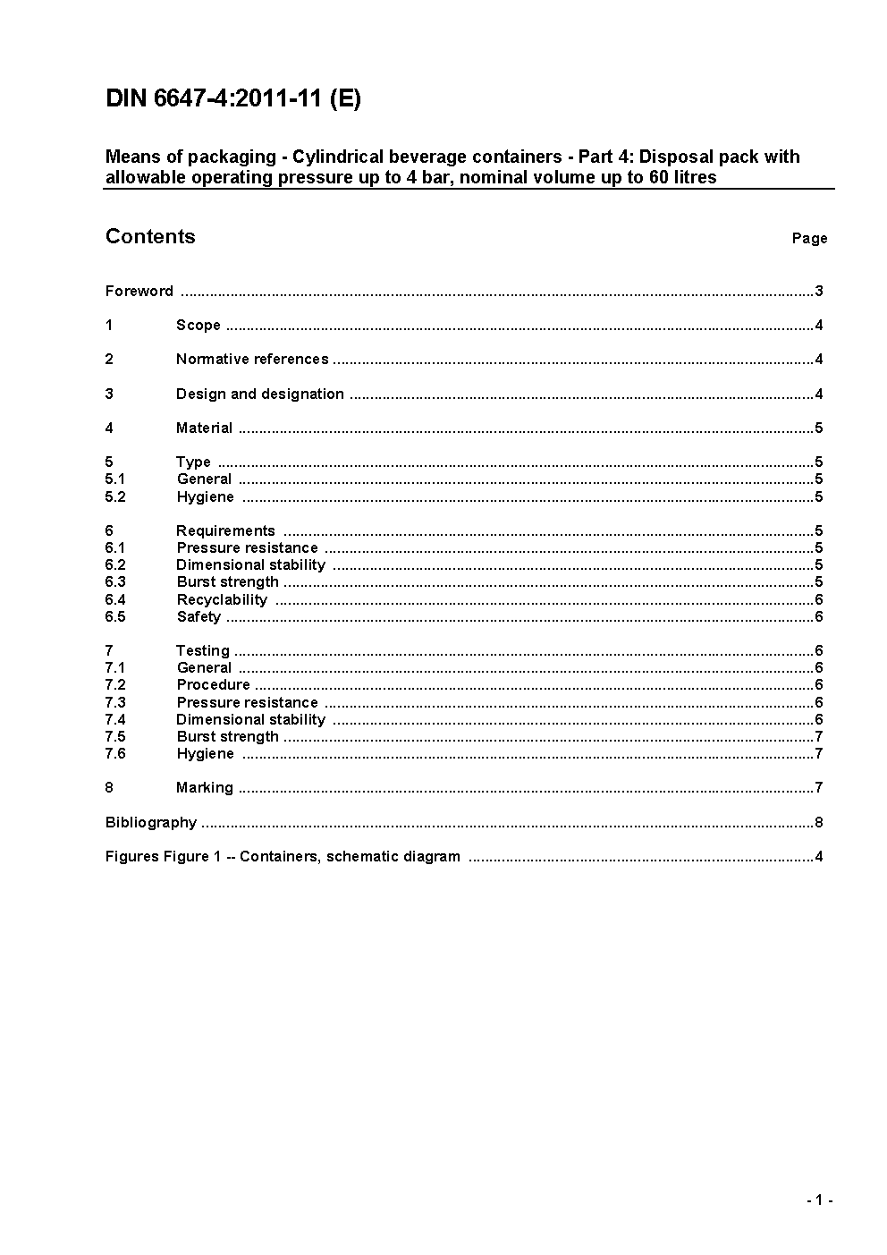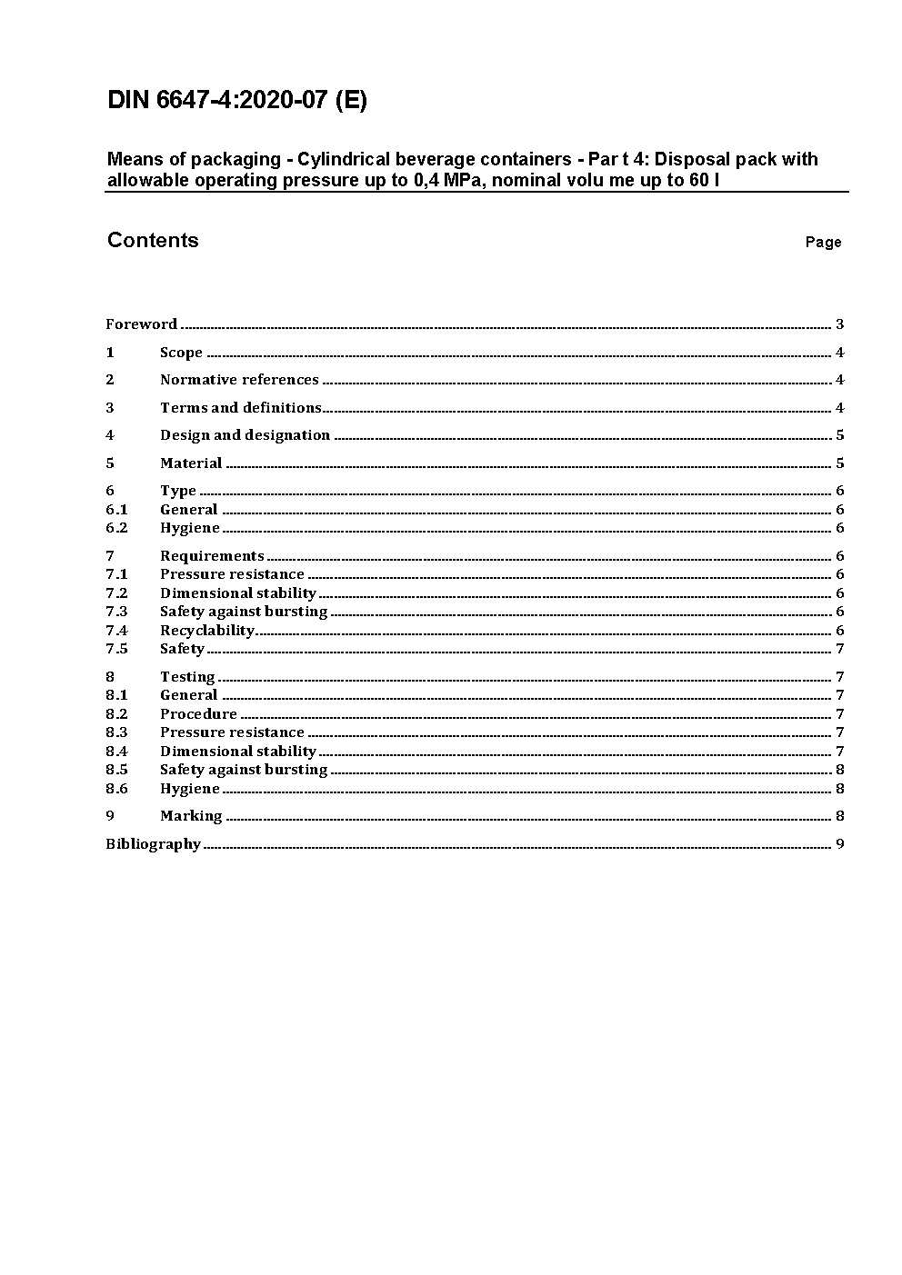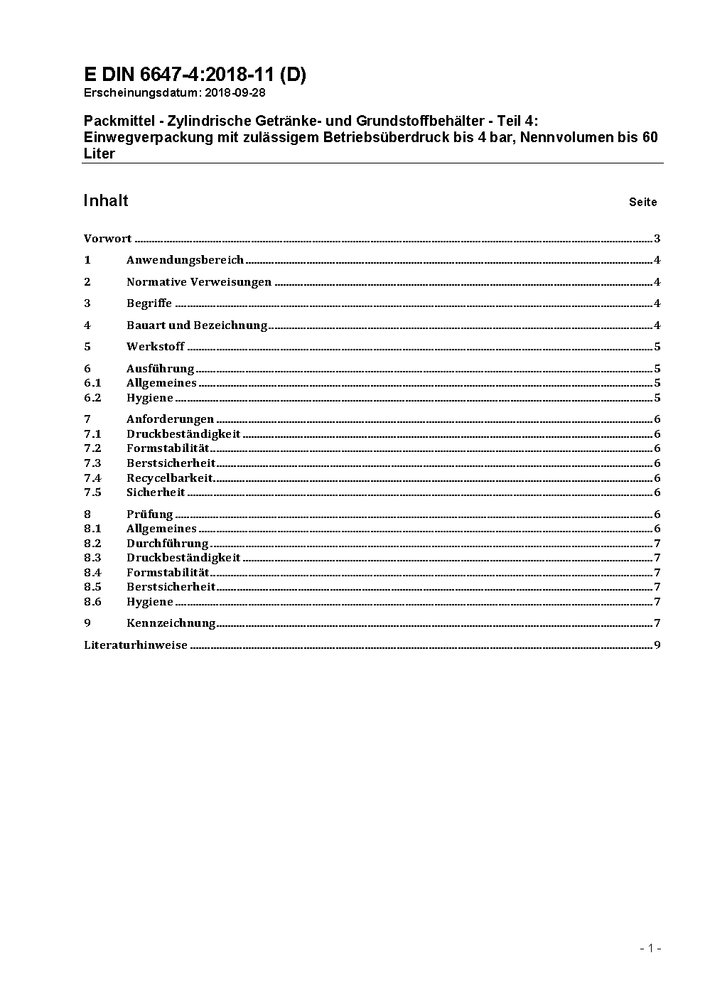 Packmittel - Zylindrische Getränke- und Grundstoffbehälter - Teil 4: Einwegverpackung mit zulässigem Betriebsüberdruck bis 4 bar, Nennvolumen bis 60 Liter / Achtung: Übergangsfrist, festgelegt durch DIN 6647-4 (2020-07), bis 2020-12-31 beachten.