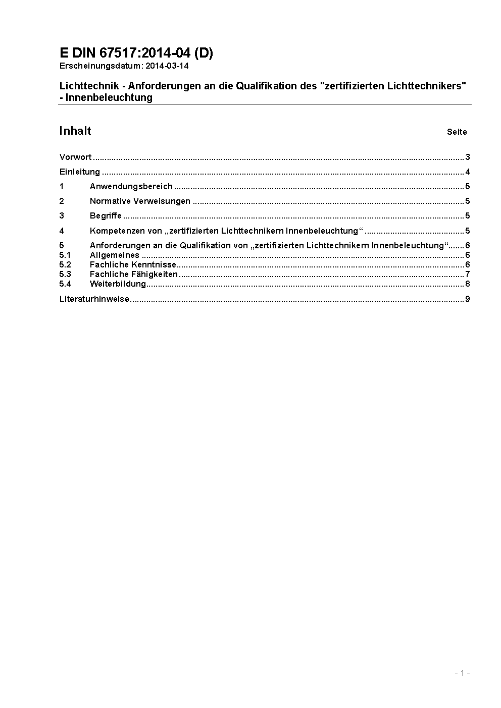 Lichttechnik - Anforderungen an die Qualifikation des Lichttechnikers - Innenbeleuchtung