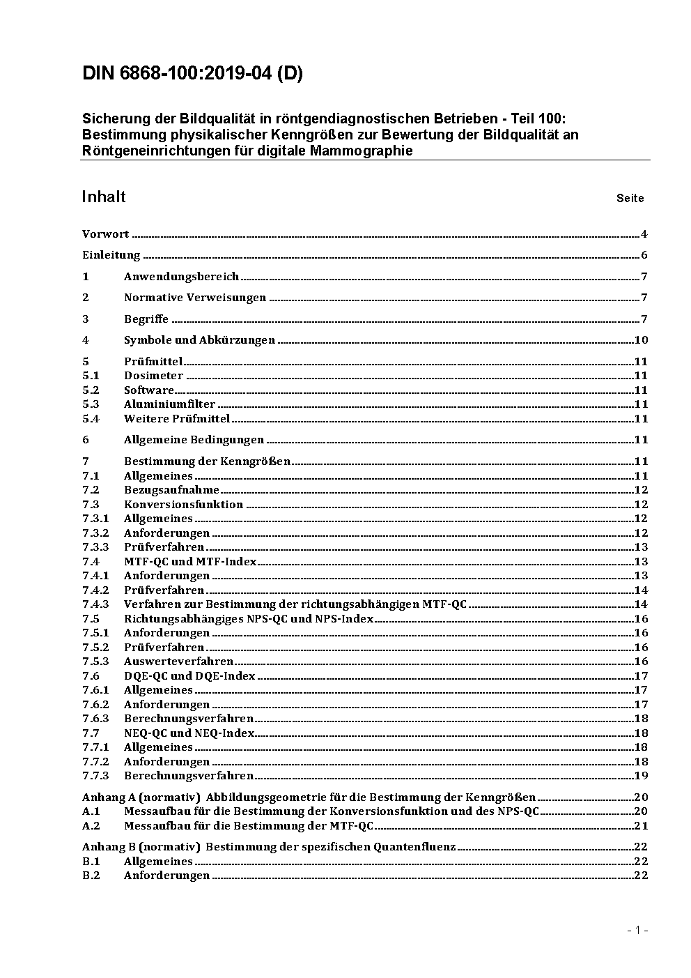 Sicherung der Bildqualität in röntgendiagnostischen Betrieben - Teil 100: Bestimmung physikalischer Kenngrößen zur Bewertung der Bildqualität an Röntgeneinrichtungen für digitale Mammographie