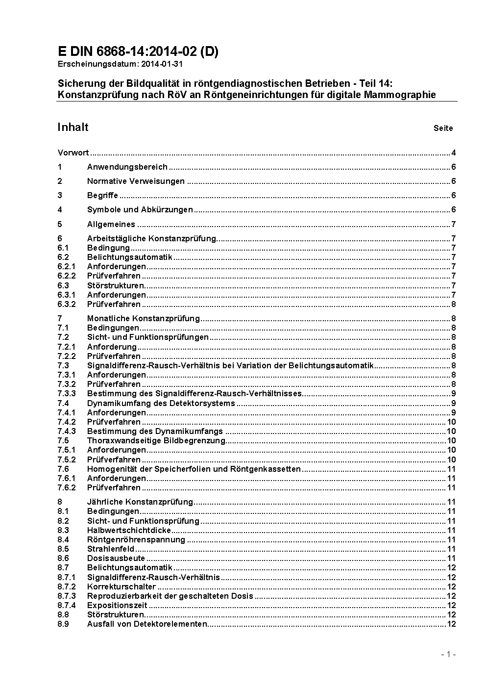 Sicherung der Bildqualität in röntgendiagnostischen Betrieben - Teil 14: Konstanzprüfung an Röntgeneinrichtungen für digitale Mammographie