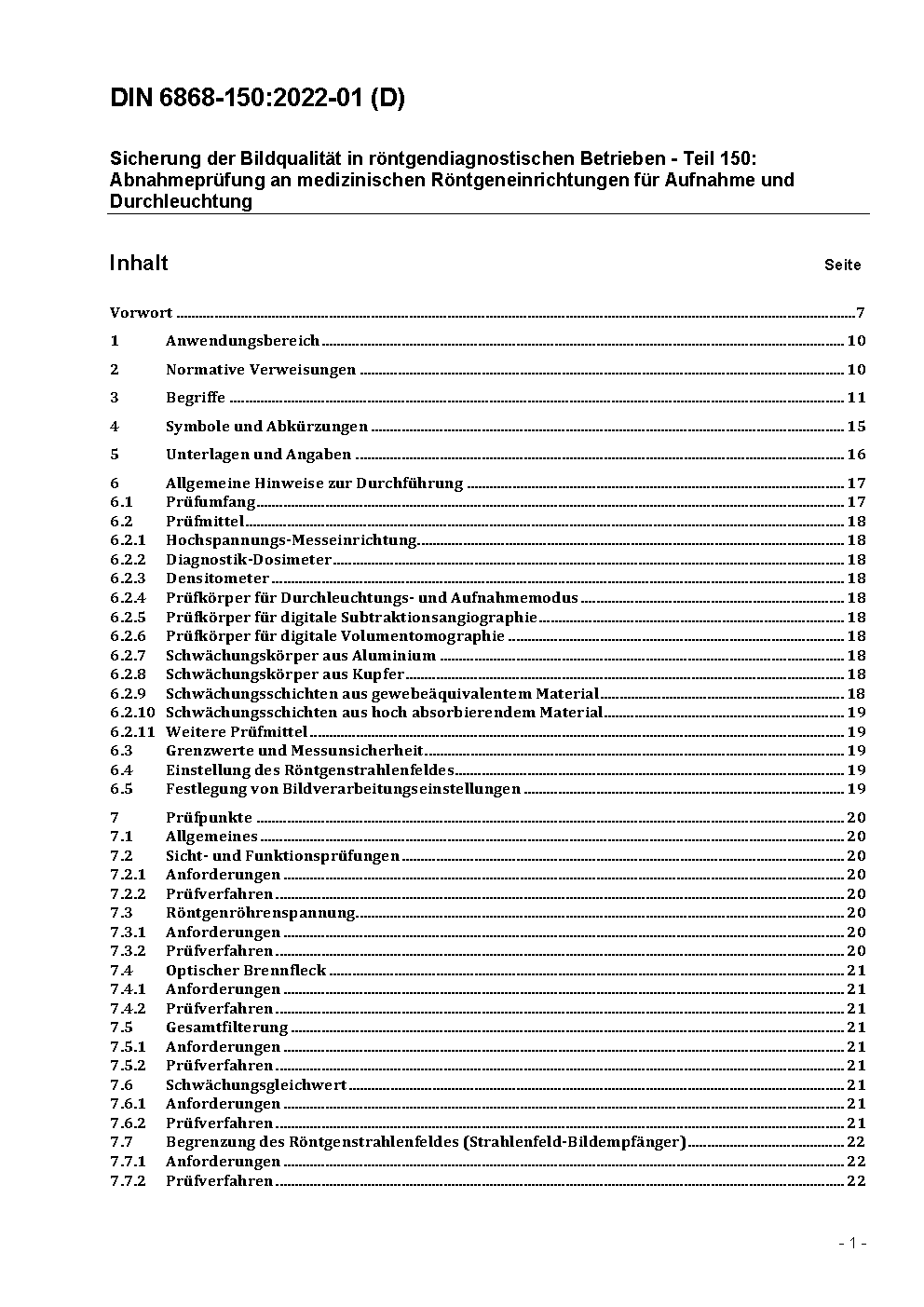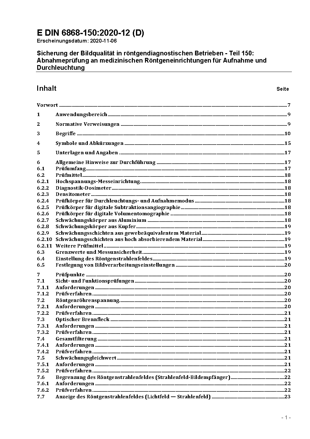 Sicherung der Bildqualität in röntgendiagnostischen Betrieben - Teil 150: Abnahmeprüfung an medizinischen Röntgeneinrichtungen für Aufnahme und Durchleuchtung