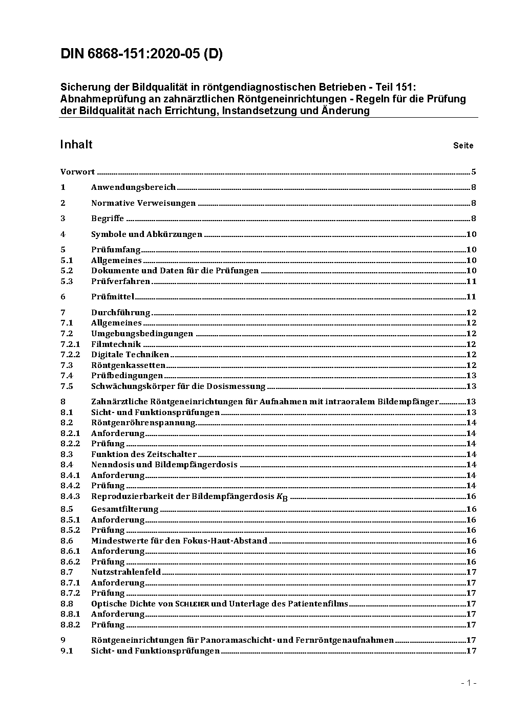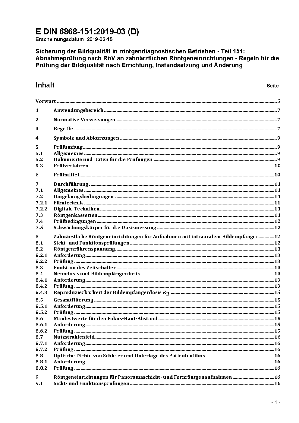 Image quality assurance in diagnostic X-ray departments - Part 151: Acceptance testing of dental radiographic equipment accordance to RöV - Rules for the inspection of image quality after installation, maintenance and modification