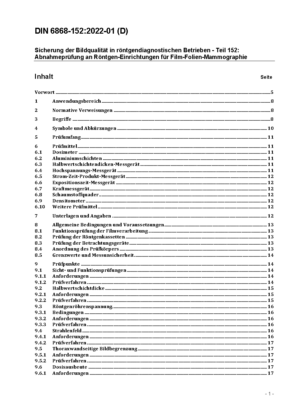 Sicherung der Bildqualität in röntgendiagnostischen Betrieben - Teil 152: Abnahmeprüfung an Röntgen-Einrichtungen für Mammographie / Achtung: Gilt in Verbindung mit DIN EN 61223-3-2 (2001-03)