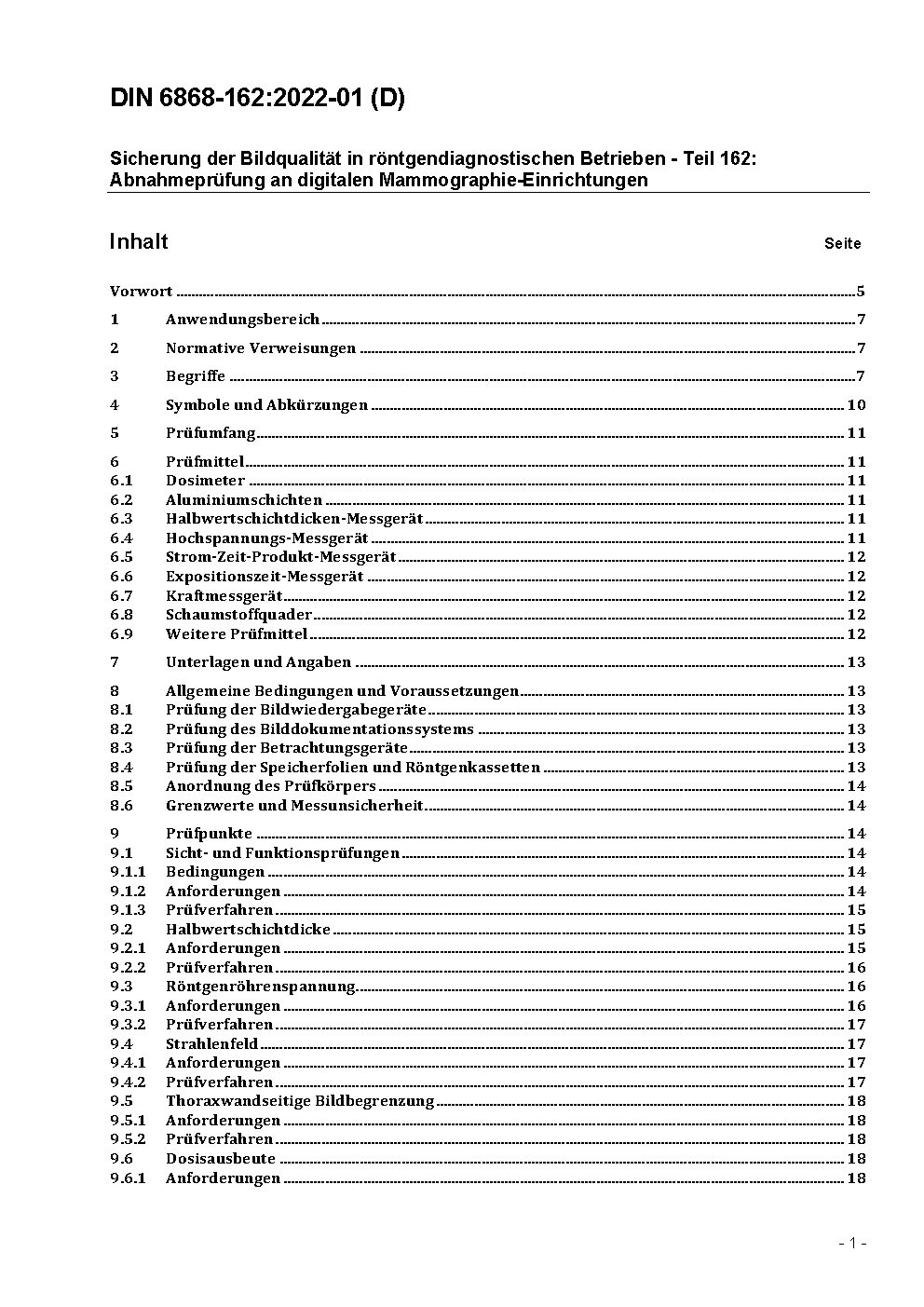 Image quality assurance in diagnostic X-ray departments - Part 162: RöV acceptance test of X-ray installations for digital mammography
