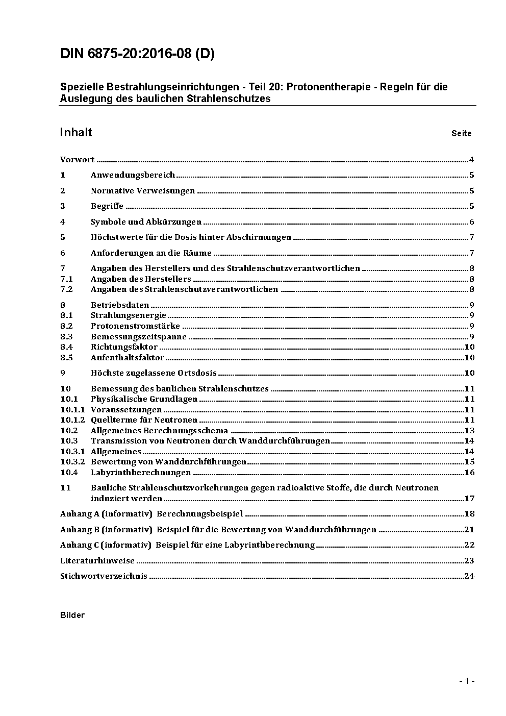 Spezielle Bestrahlungseinrichtungen - Teil 20: Protonentherapie - Regeln für die Auslegung des baulichen Strahlenschutzes
