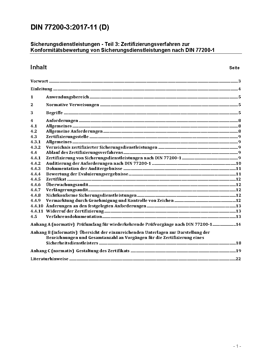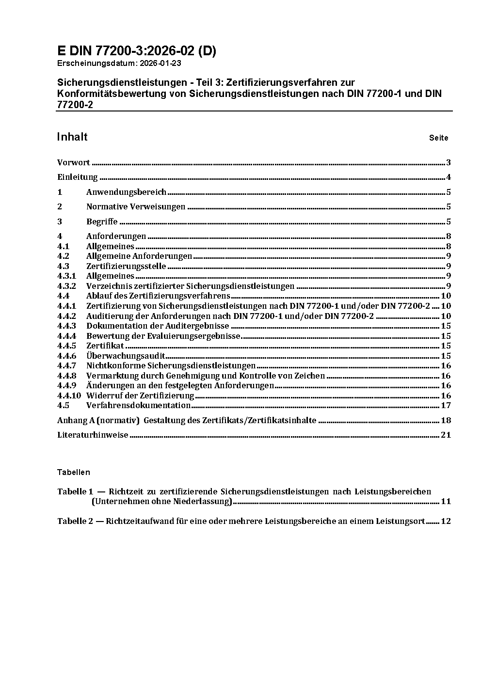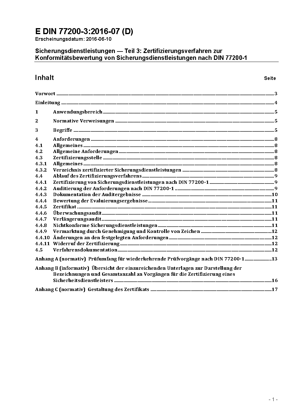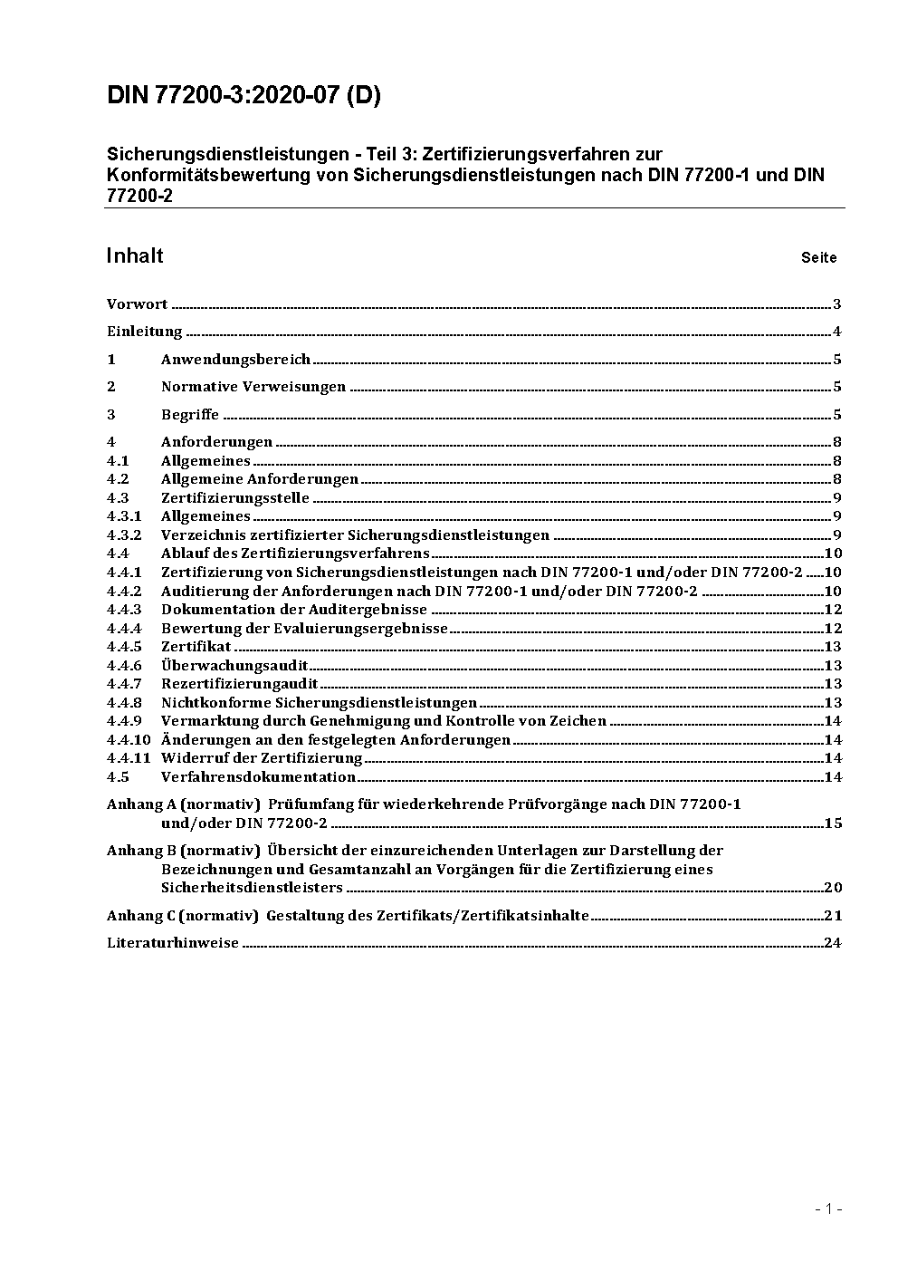 Sicherungsdienstleistungen - Teil 3: Zertifizierungsverfahren zur Konformitätsbewertung von Sicherungsdienstleistungen nach DIN 77200-1 / Achtung: Daneben gilt DIN 77200 (2008-05) noch bis 2018-11-01.*Übergangsfrist, festgelegt durch DIN 77200-3 (2020-07), bis 2021-07-01 beachten.
