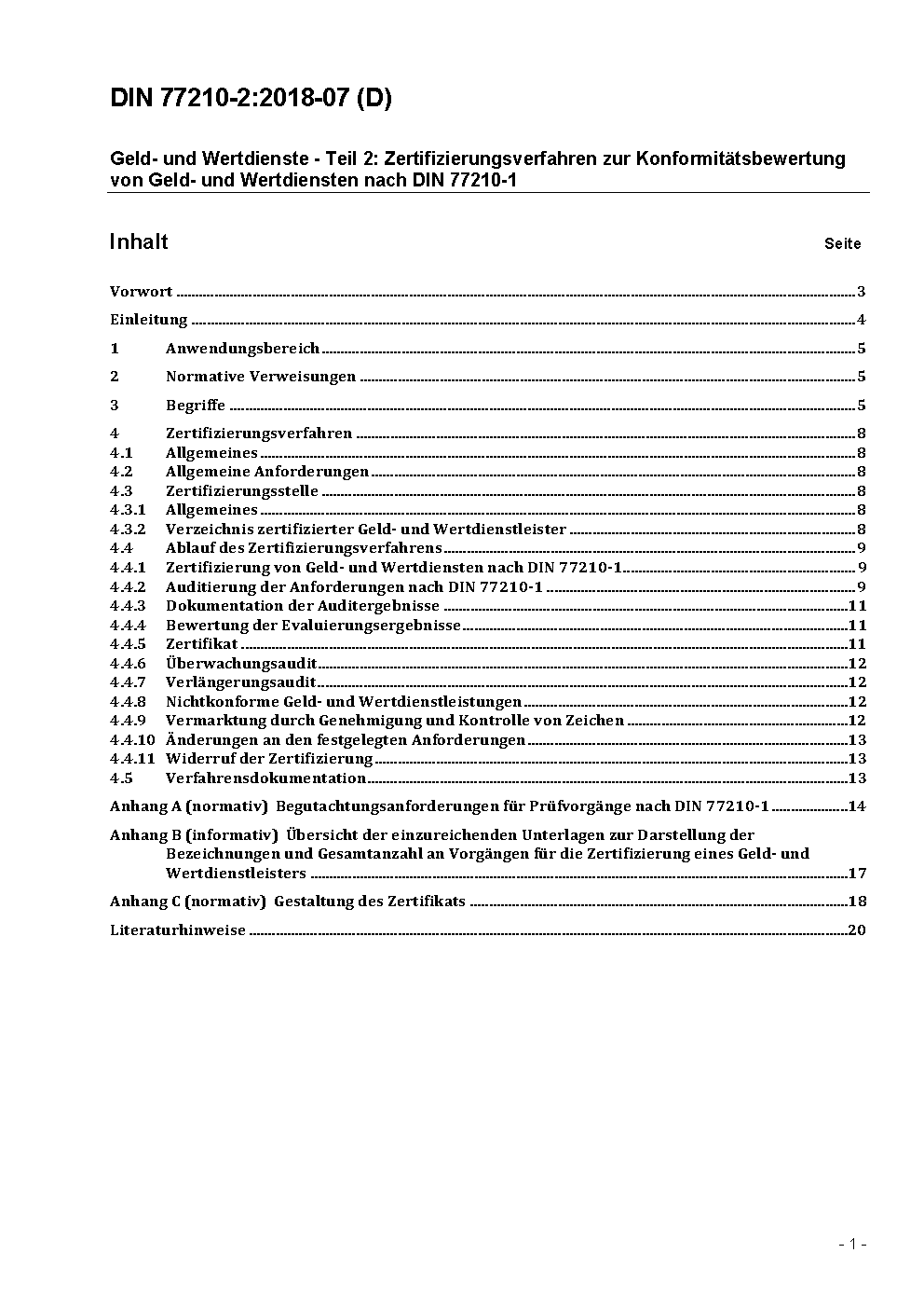 Geld- und Wertdienste - Teil 2: Zertifizierungsverfahren zur Konformitätsbewertung von Geld- und Wertdiensten nach DIN 77210-1