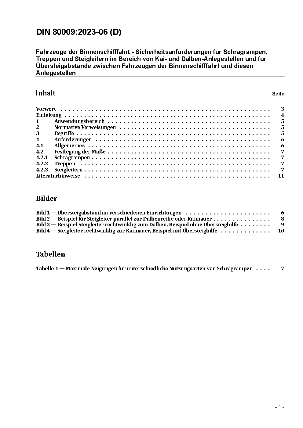 Fahrzeuge der Binnenschifffahrt - Sicherheitsanforderungen für Schrägrampen, Treppen und Steigleitern im Bereich von Kai- und Dalben-Anlegestellen und für Übersteigabstände zwischen Fahrzeugen der Binnenschifffahrt und diesen Anlegestellen