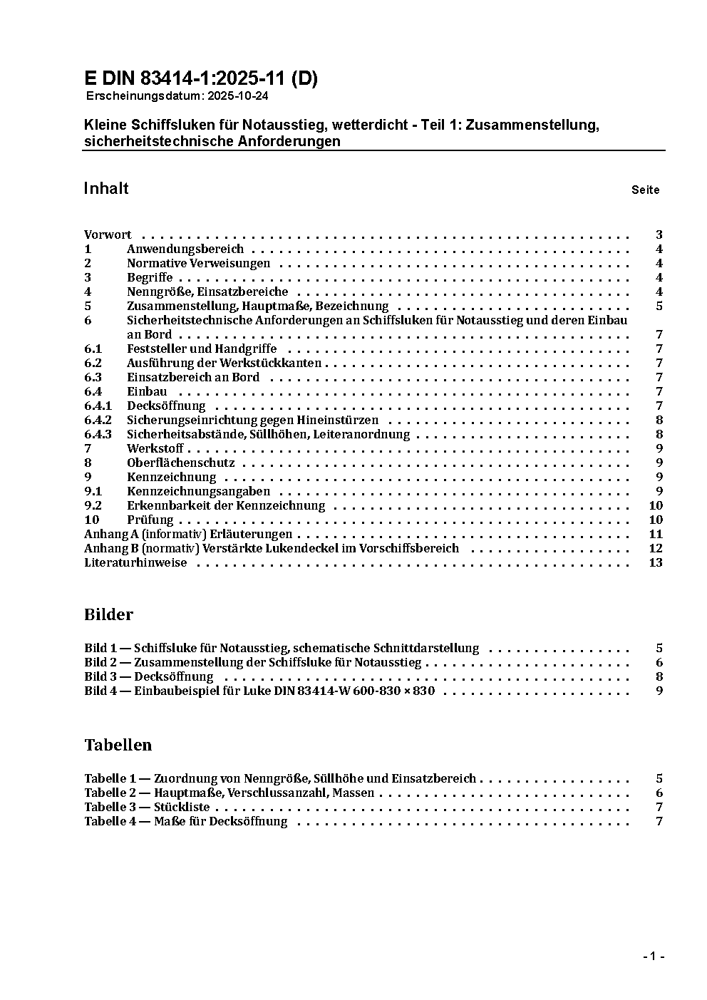 Kleine Schiffsluken für Notausstieg, wetterdicht - Teil 1: Zusammenstellung, sicherheitstechnische Anforderungen