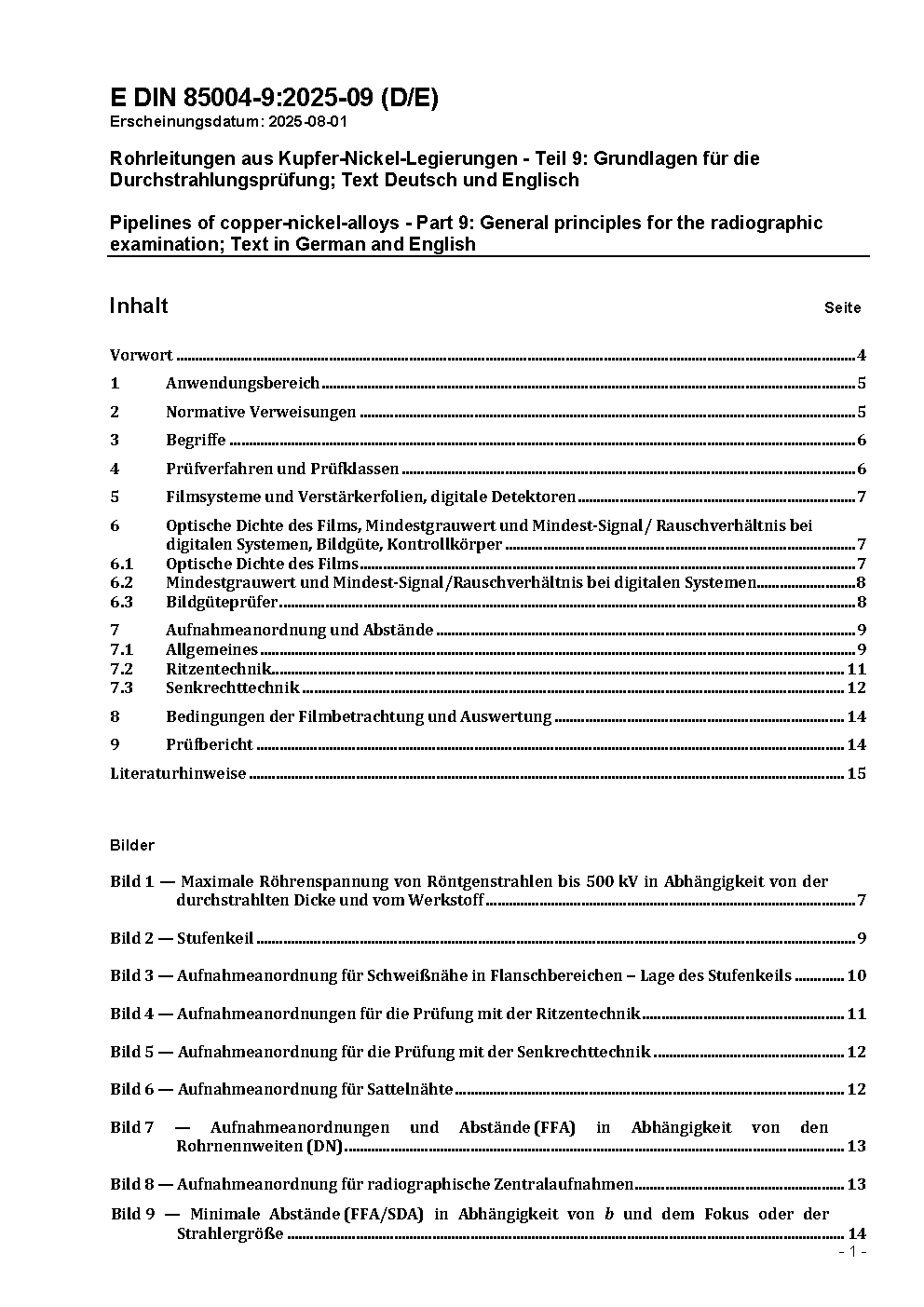 Rohrleitungen aus Kupfer-Nickel-Legierungen - Teil 9: Grundlagen für die Durchstrahlungsprüfung; Text Deutsch und Englisch