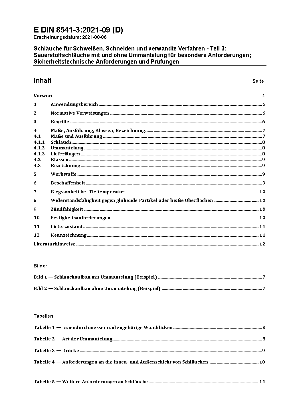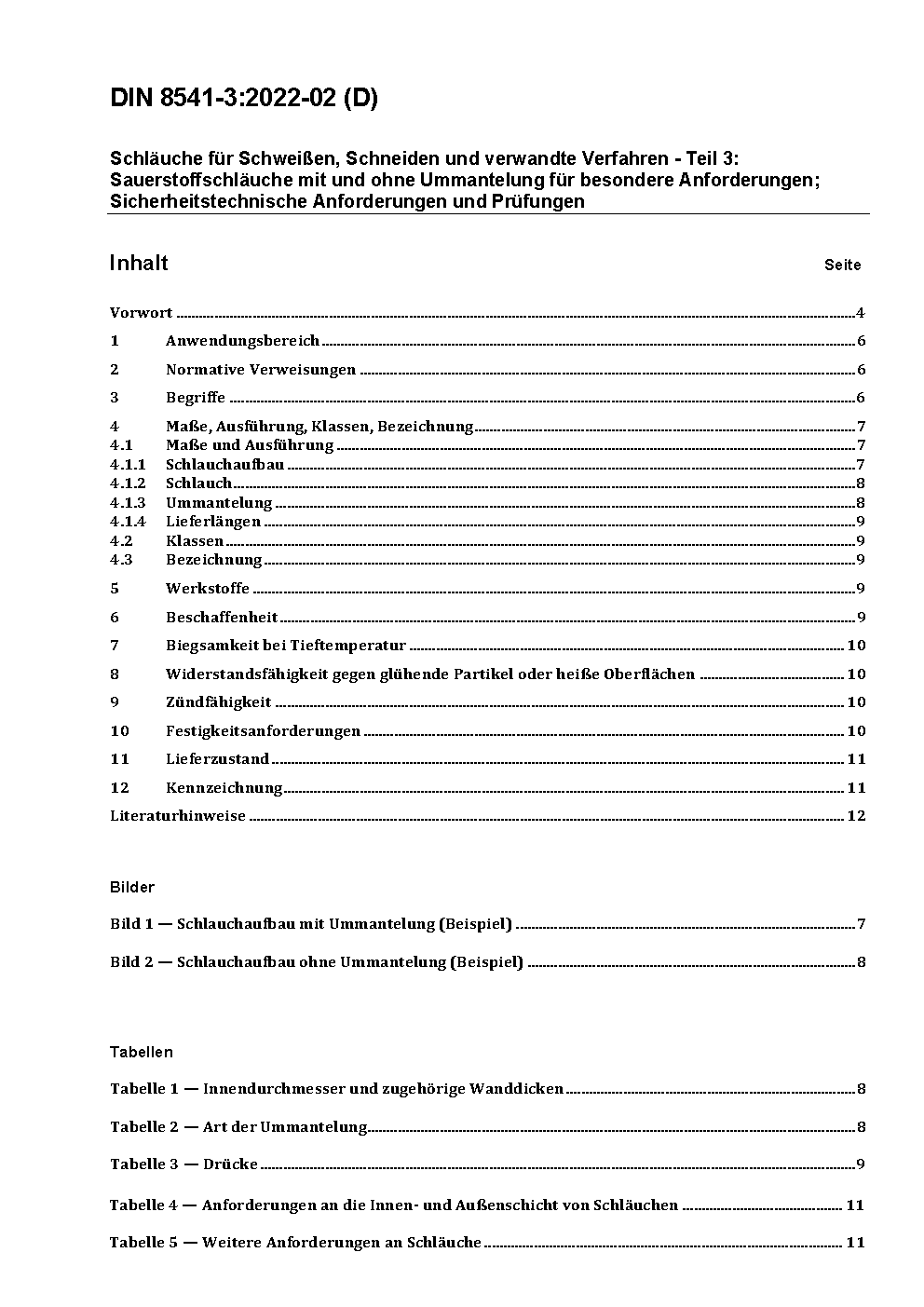 Schläuche für Schweißen, Schneiden und verwandte Verfahren - Teil 3: Sauerstoffschläuche mit und ohne Ummantelung für besondere Anforderungen; Sicherheitstechnische Anforderungen und Prüfungen / Achtung: Übergangsfrist, festgelegt durch DIN 8541-3 (2022-02), bis 2022-07-31 beachten.