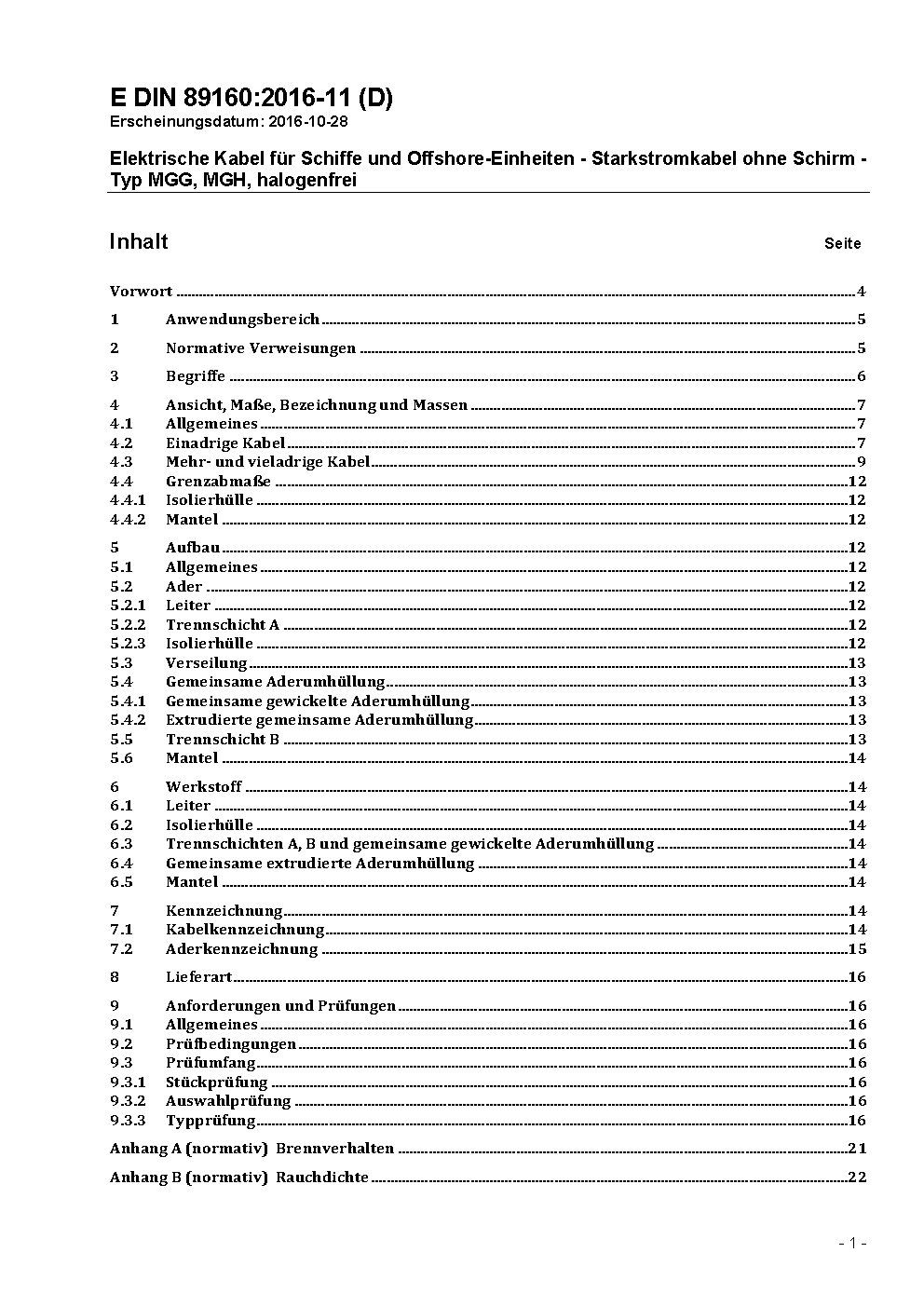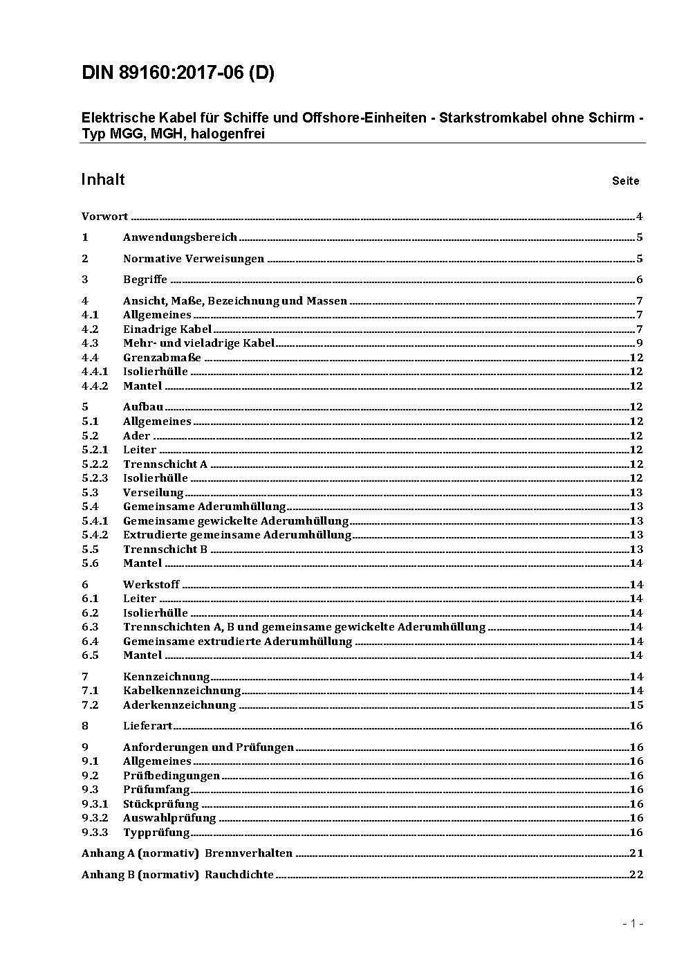 Electrical cables for ships and offshore-units - Single and multicore power cables with extruded solid insulation without screen - Type MGG