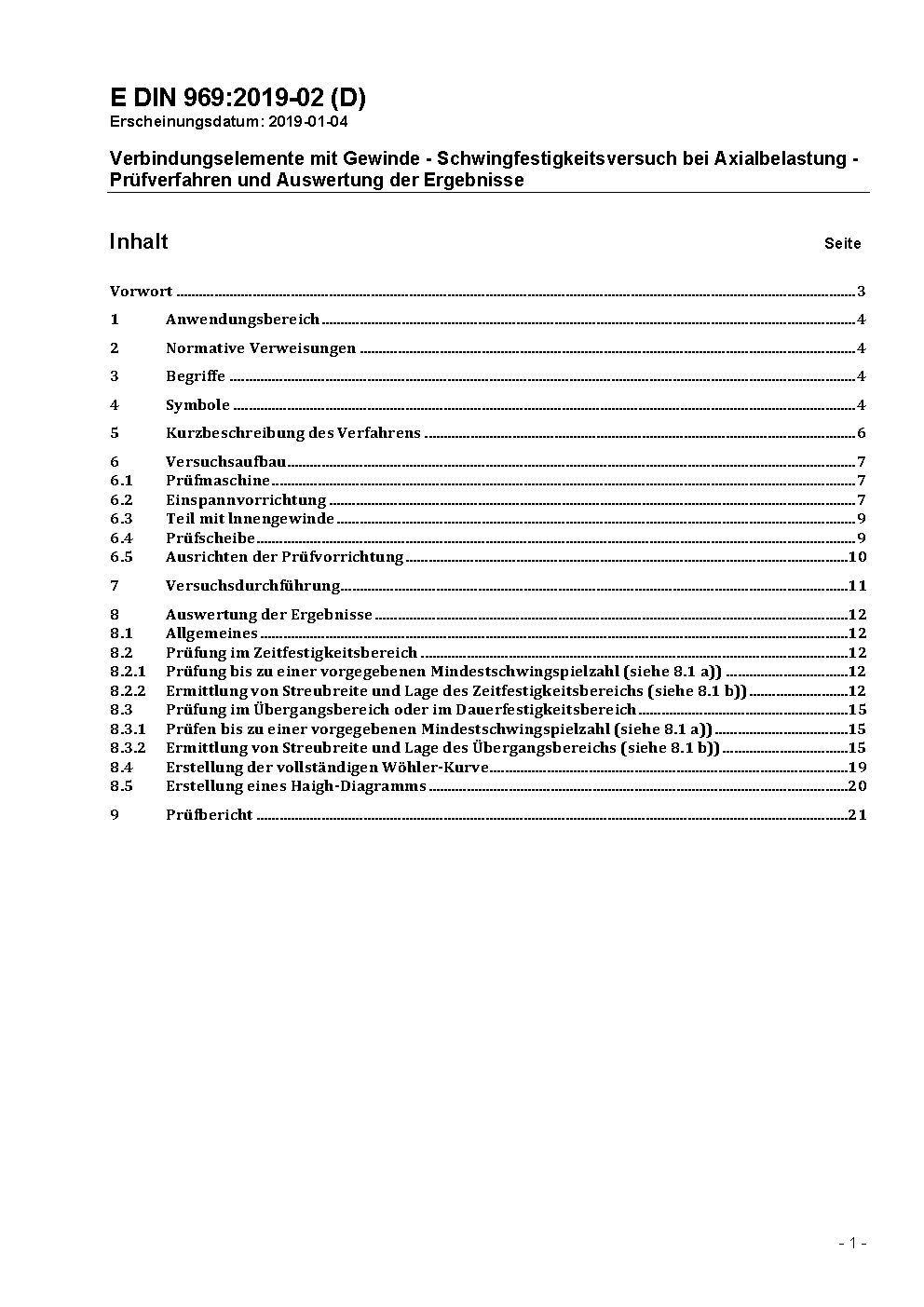 Verbindungselemente mit Gewinde - Schwingfestigkeitsversuch bei Axialbelastung - Prüfverfahren und Auswertung der Ergebnisse