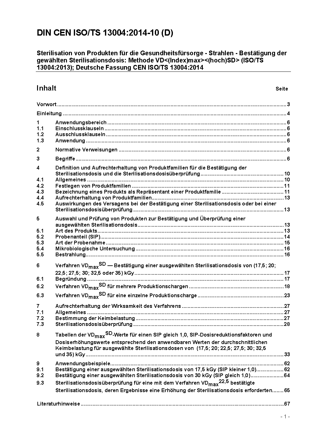 Sterilisation von Produkten für die Gesundheitsfürsorge - Strahlen - Bestätigung der gewählten Sterilisationsdosis: Methode VD<(Index)max><(hoch)SD> (ISO/TS 13004:2013); Deutsche Fassung CEN ISO/TS 13004:2014