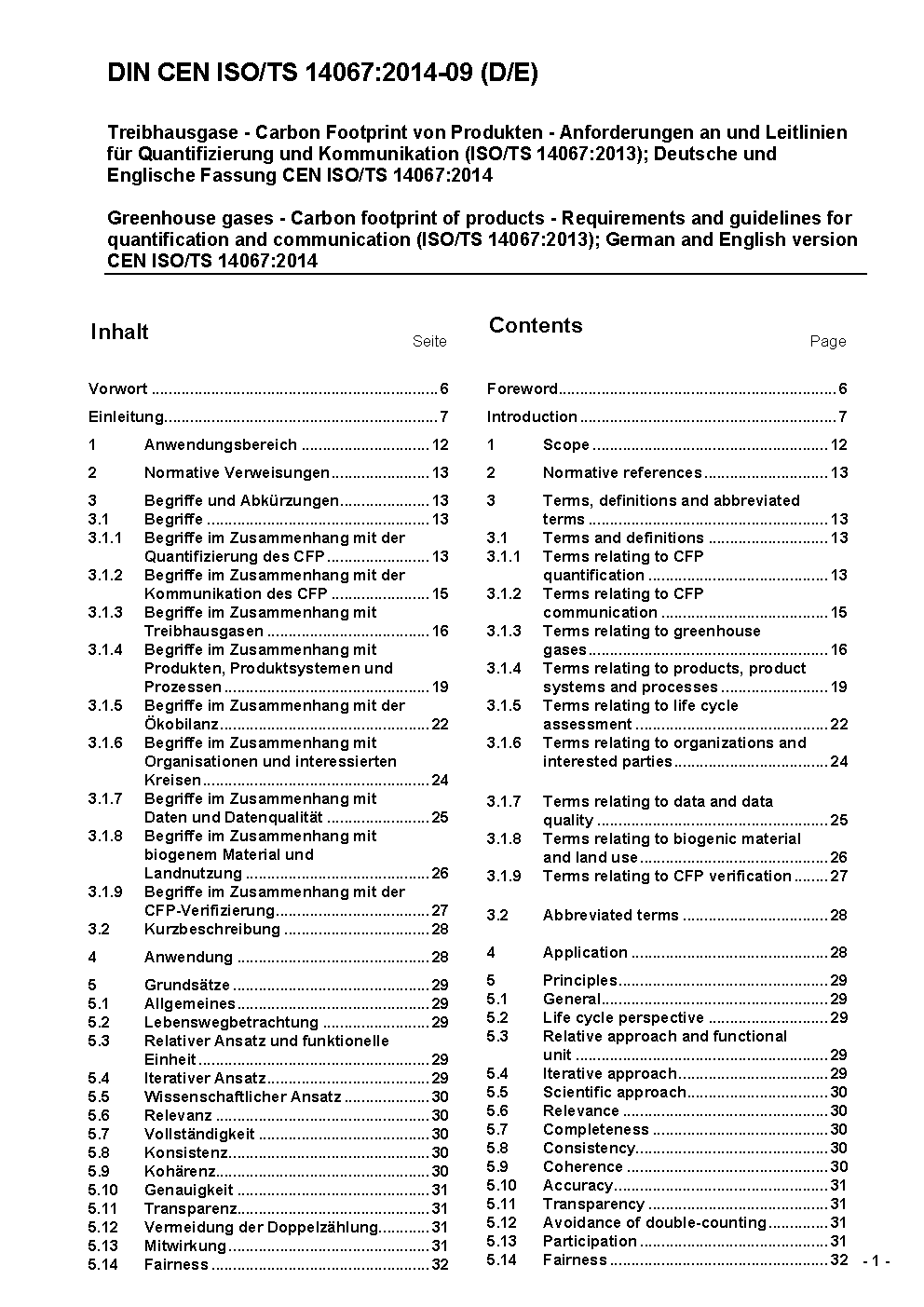 Treibhausgase - Carbon Footprint von Produkten - Anforderungen an und Leitlinien für Quantifizierung und Kommunikation (ISO/TS 14067:2013); Deutsche und Englische Fassung CEN ISO/TS 14067:2014