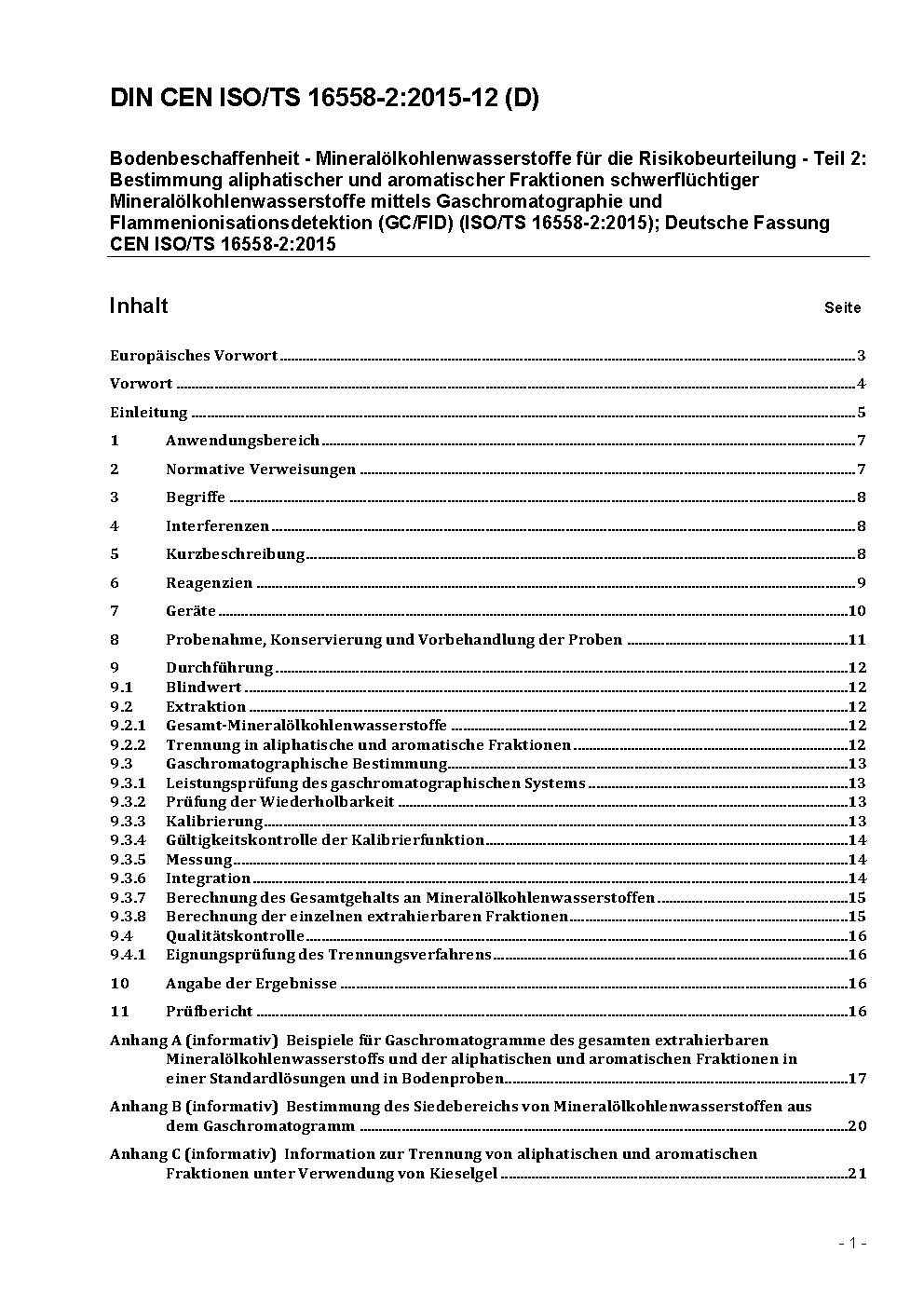 Bodenbeschaffenheit - Mineralölkohlenwasserstoffe für die Risikobeurteilung - Teil 2: Bestimmung aliphatischer und aromatischer Fraktionen schwerflüchtiger Mineralölkohlenwasserstoffe mittels Gaschromatographie und Flammenionisationsdetektion (GC/FID) (ISO/TS 16558-2:2015); Deutsche Fassung CEN ISO/TS 16558-2:2015