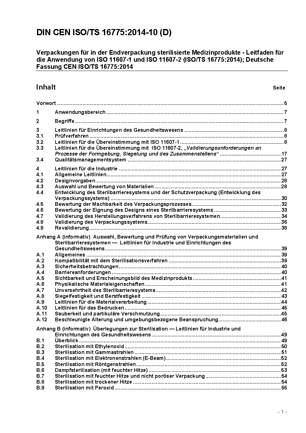 Packaging for terminally sterilized medical devices - Guidance on the application of ISO 11607-1 and ISO 11607-2 (ISO/TS 16775:2014); German version CEN ISO/TS 16775:2014