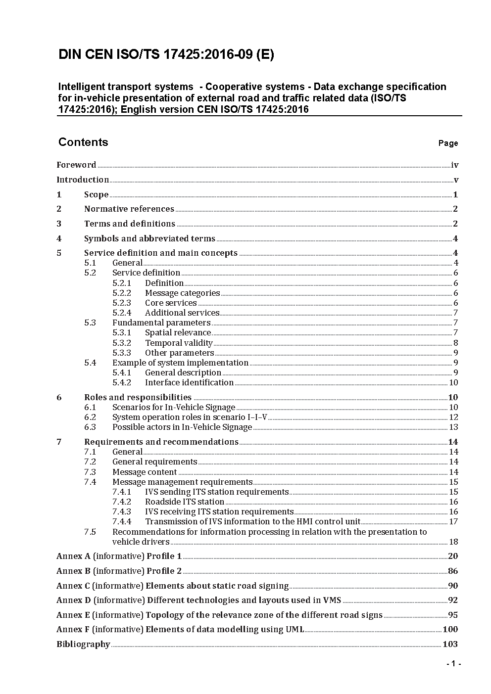 Intelligente Transportsysteme - Kooperative Systeme - Datenaustausch Spezifikation für die fahrzeuginterne Darstellung von externen Straßen- und verkehrsrelevanten Daten (ISO/TS 17425:2016); Englische Fassung CEN ISO/TS 17425:2016