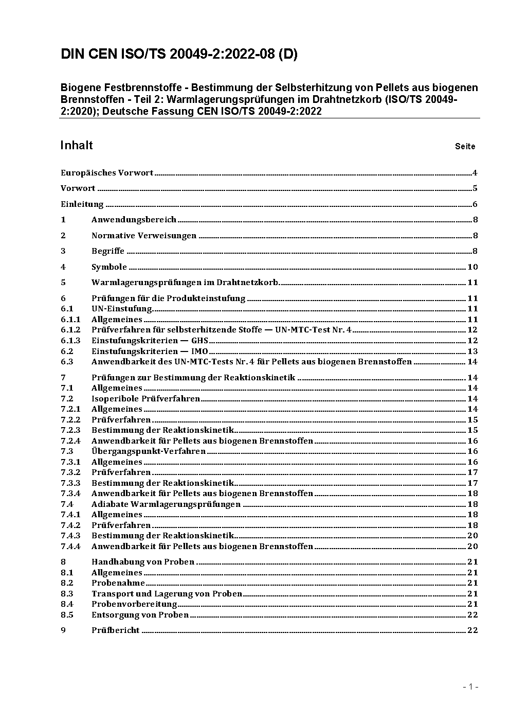 Biogene Festbrennstoffe - Bestimmung der Selbsterhitzung von Pellets aus biogenen Brennstoffen - Teil 2: Warmlagerungsprüfungen im Drahtnetzkorb (ISO/TS 20049-2:2020); Deutsche Fassung CEN ISO/TS 20049-2:2022