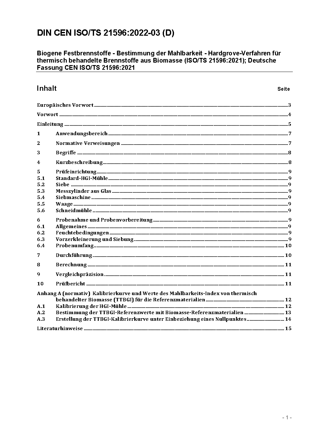 Biogene Festbrennstoffe - Bestimmung der Mahlbarkeit - Hardgrove-Verfahren für thermisch behandelte Brennstoffe aus Biomasse (ISO/TS 21596:2021); Deutsche Fassung CEN ISO/TS 21596:2021