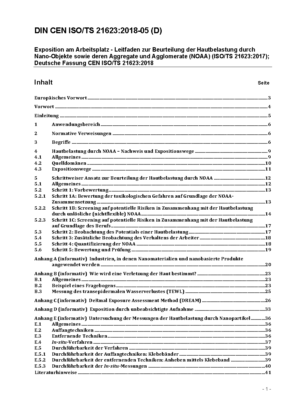 Workplace exposure - Assessment of dermal exposure to nano-objects and their aggregates and agglomerates (NOAA) (ISO/TS 21623:2017); German version CEN ISO/TS 21623:2018