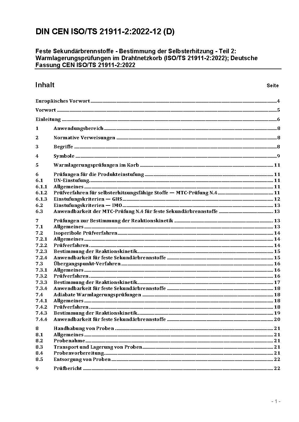 Solid recovered fuels - Determination of self-heating - Part 2: Basket heating tests (ISO/TS 21911-2:2022); German version CEN ISO/TS 21911-2:2022