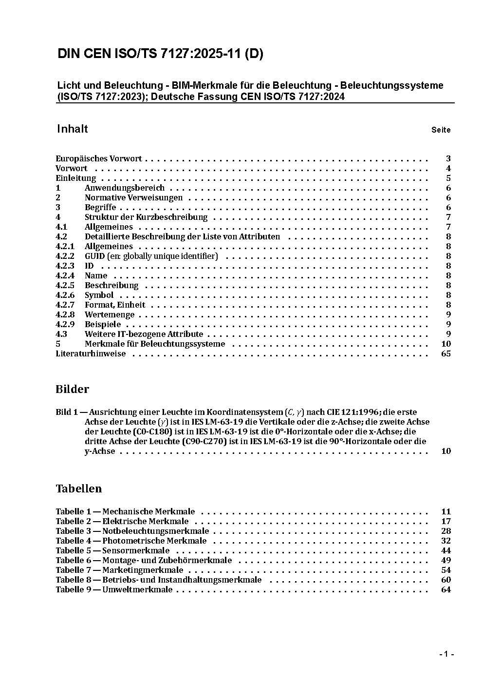 Licht und Beleuchtung - BIM-Merkmale für die Beleuchtung - Beleuchtungssysteme (ISO/TS 7127:2023); Deutsche Fassung CEN ISO/TS 7127:2024