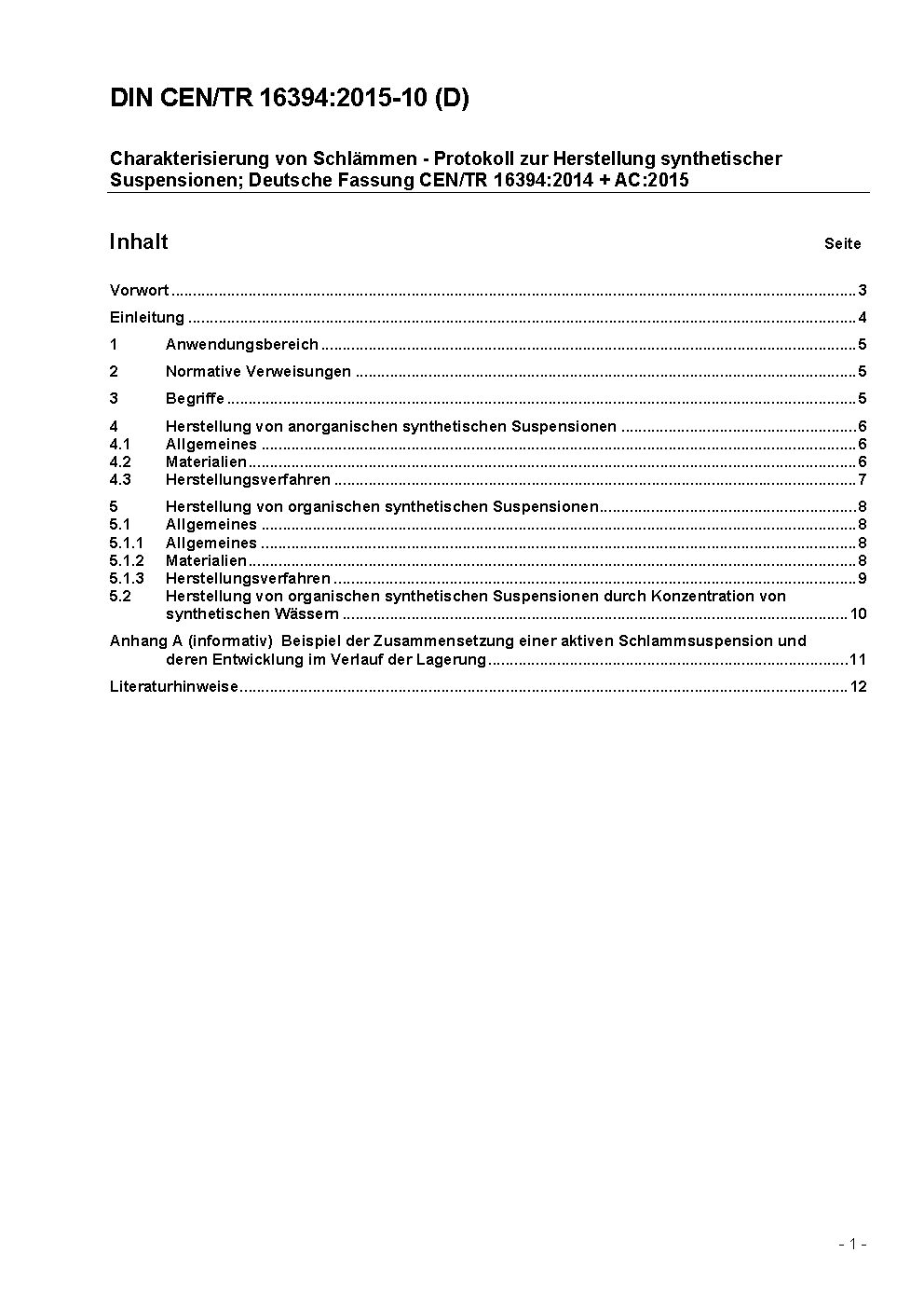 Characterization of sludges - Protocol for preparing synthetic suspensions; German version CEN/TR 16394:2014 + AC:2015