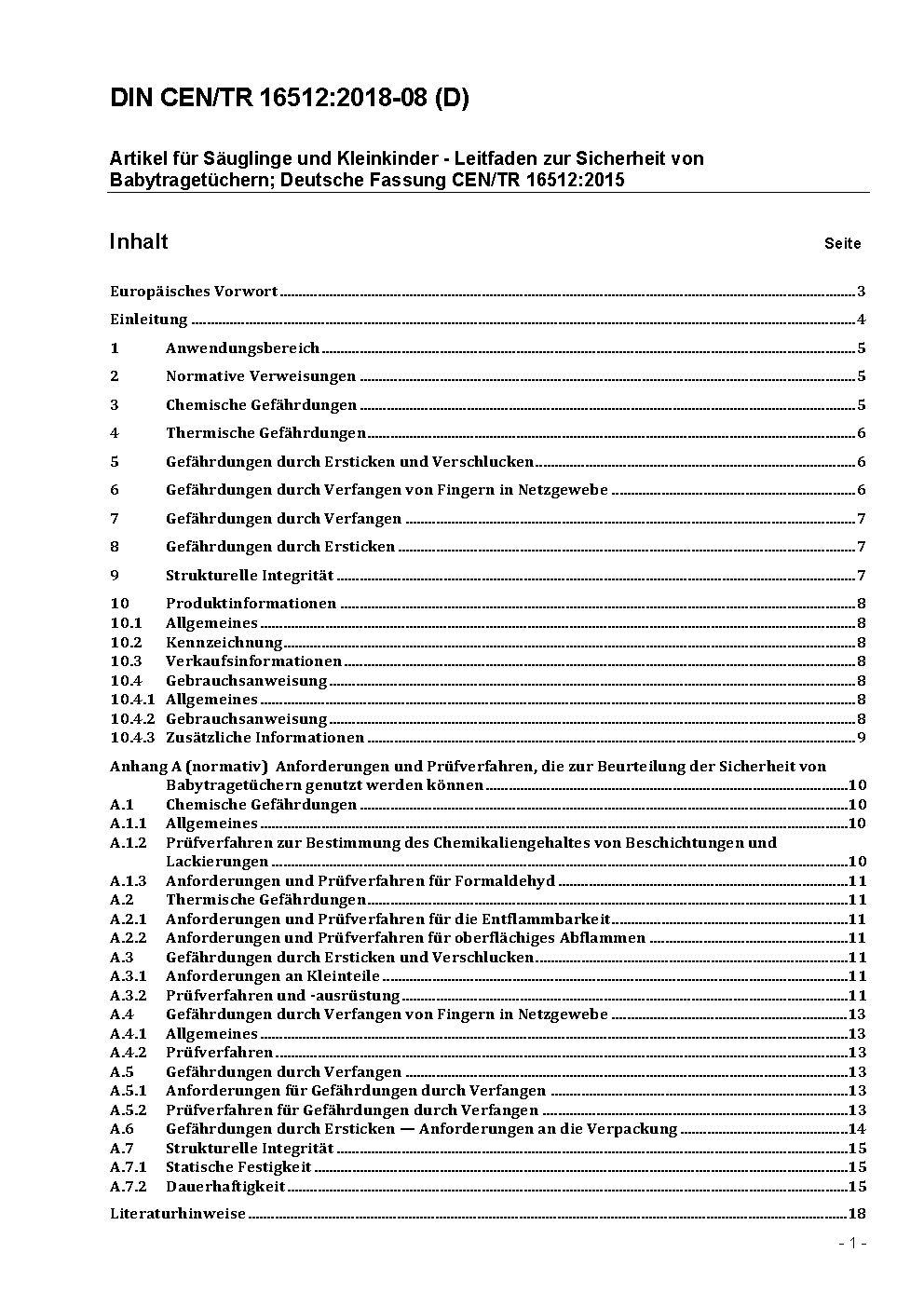 Artikel für Säuglinge und Kleinkinder - Leitfaden zur Sicherheit von Babytragetüchern; Deutsche Fassung CEN/TR 16512:2015