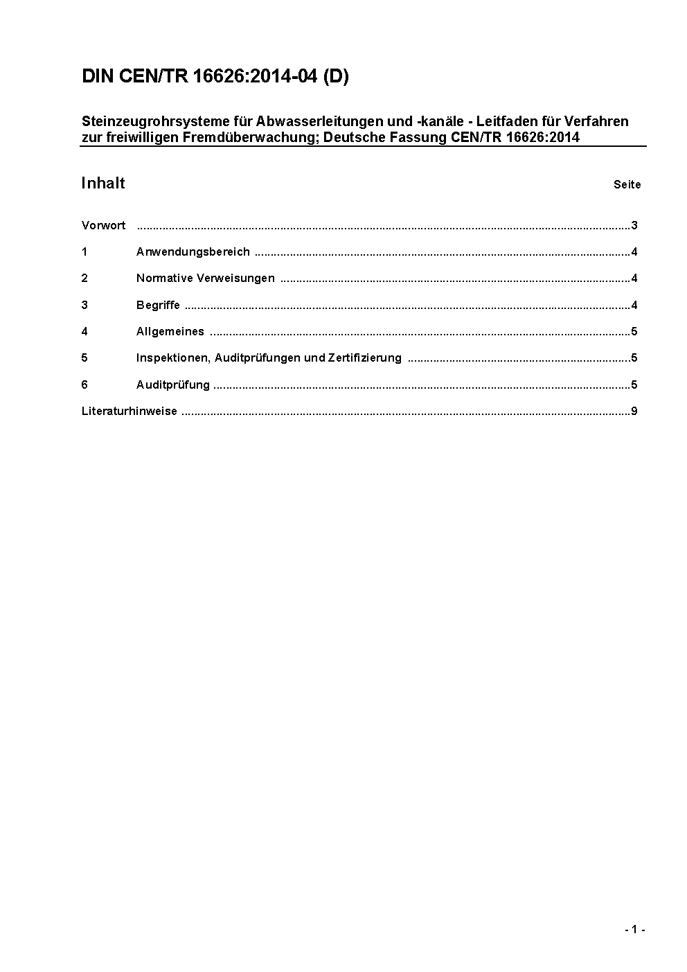 Steinzeugrohrsysteme für Abwasserleitungen und -kanäle - Leitfaden für Verfahren zur freiwilligen Fremdüberwachung; Deutsche Fassung CEN/TR 16626:2014