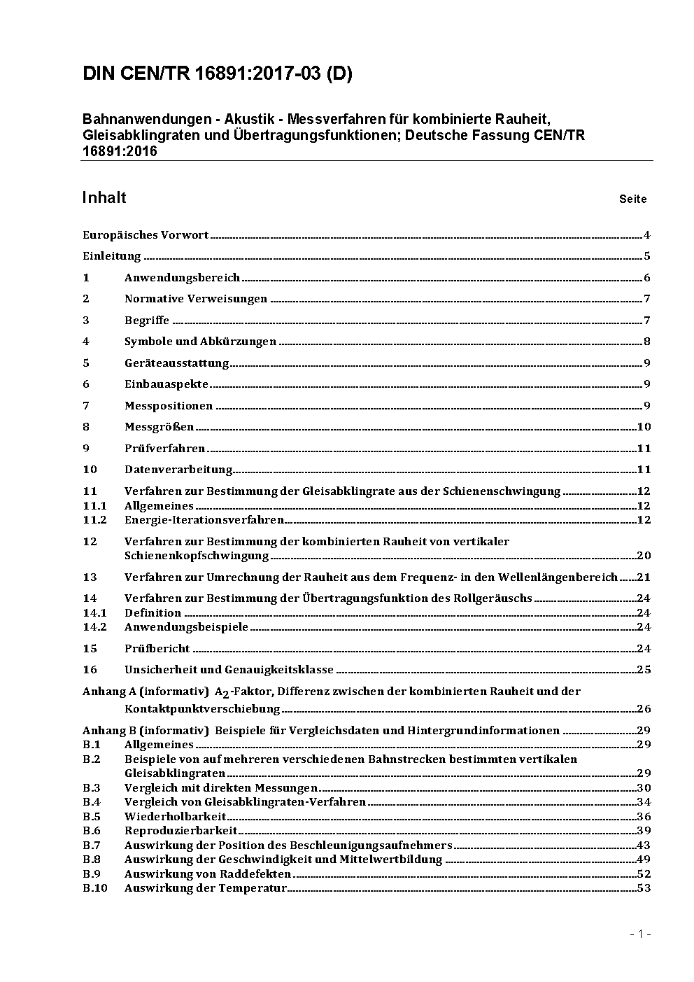 Bahnanwendungen - Akustik - Messverfahren für kombinierte Rauheit, Gleisabklingraten und Übertragungsfunktionen; Deutsche Fassung CEN/TR 16891:2016