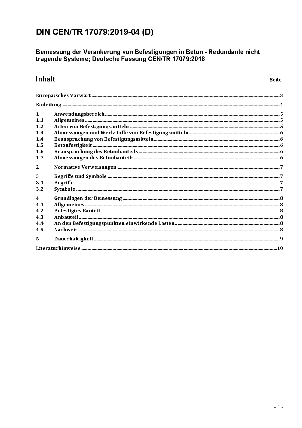 Bemessung der Verankerung von Befestigungen in Beton - Redundante nicht tragende Systeme; Deutsche Fassung CEN/TR 17079:2018