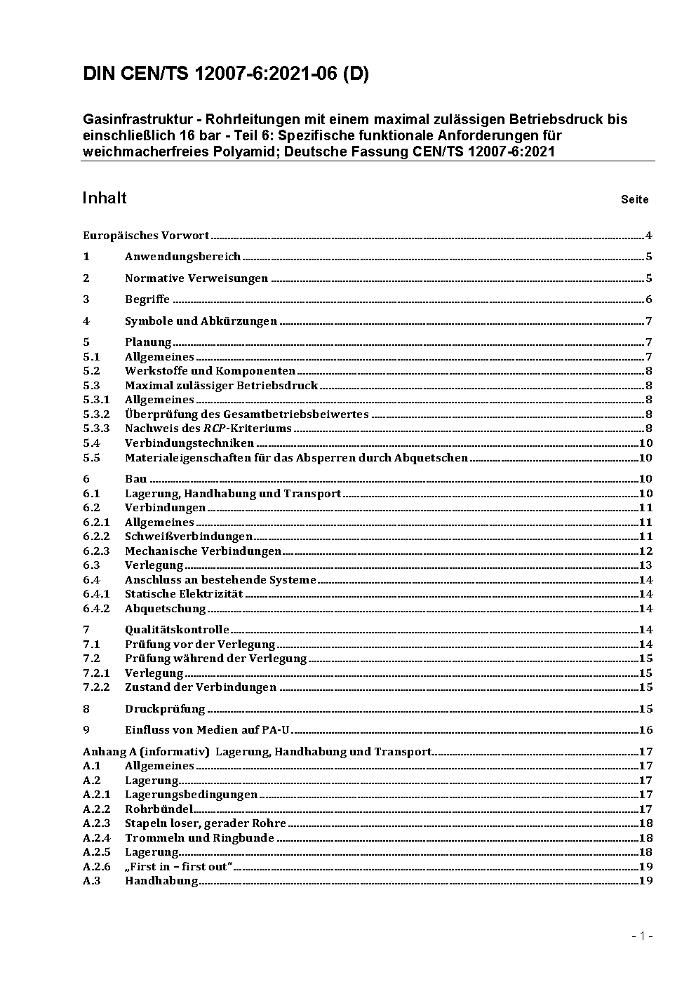 Gas infrastructure - Pipelines for maximum operating pressure up to and including 16 bar - Part 6: Specific functional recommendations for unplasticized polyamide (PA-U); German version CEN/TS 12007-6:2021.