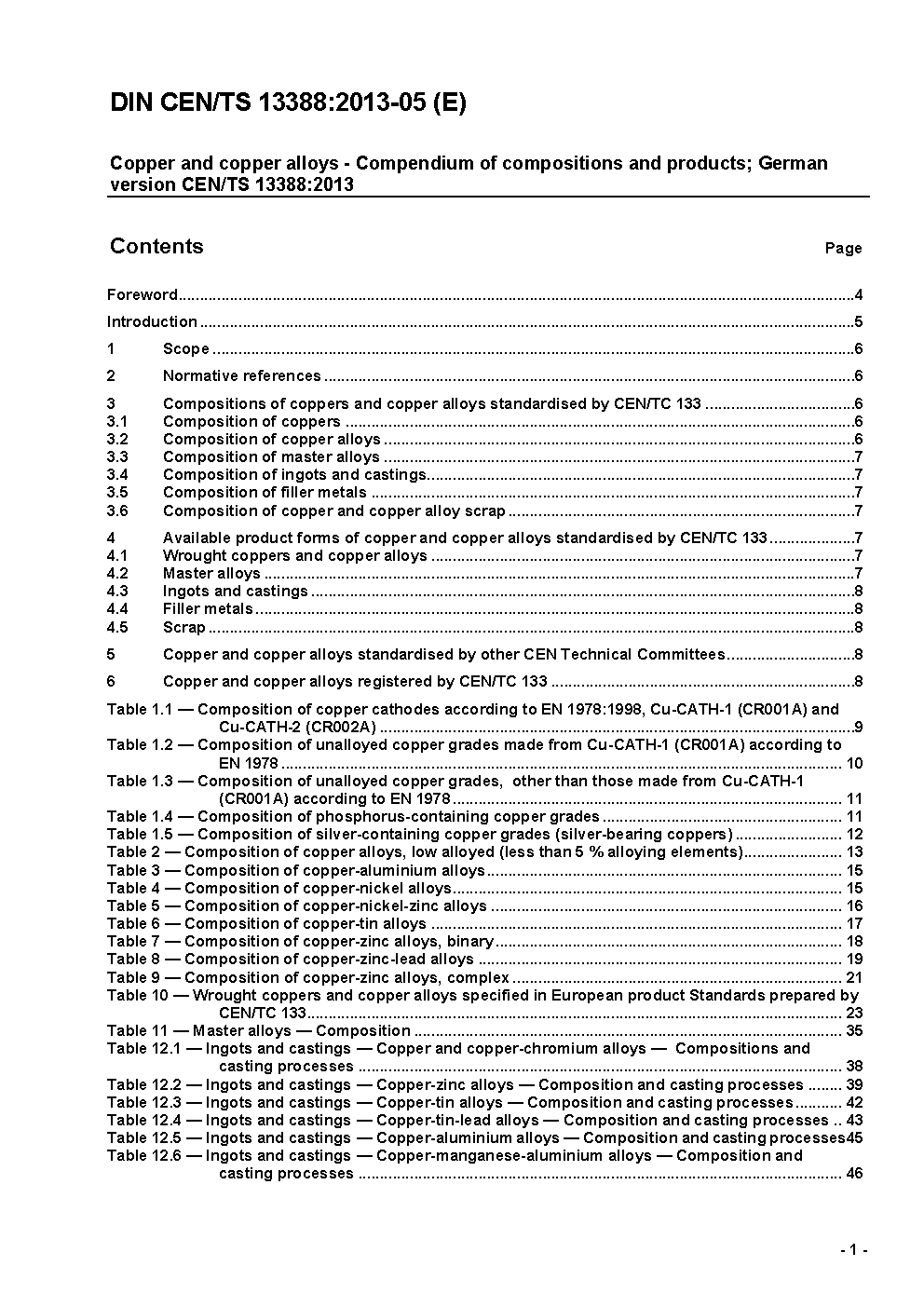 Copper and copper alloys - Compendium of compositions and products; German version CEN/TS 13388:2013
