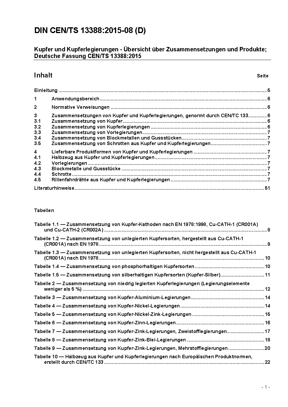 Kupfer und Kupferlegierungen - Übersicht über Zusammensetzungen und Produkte; Deutsche Fassung CEN/TS 13388:2013
