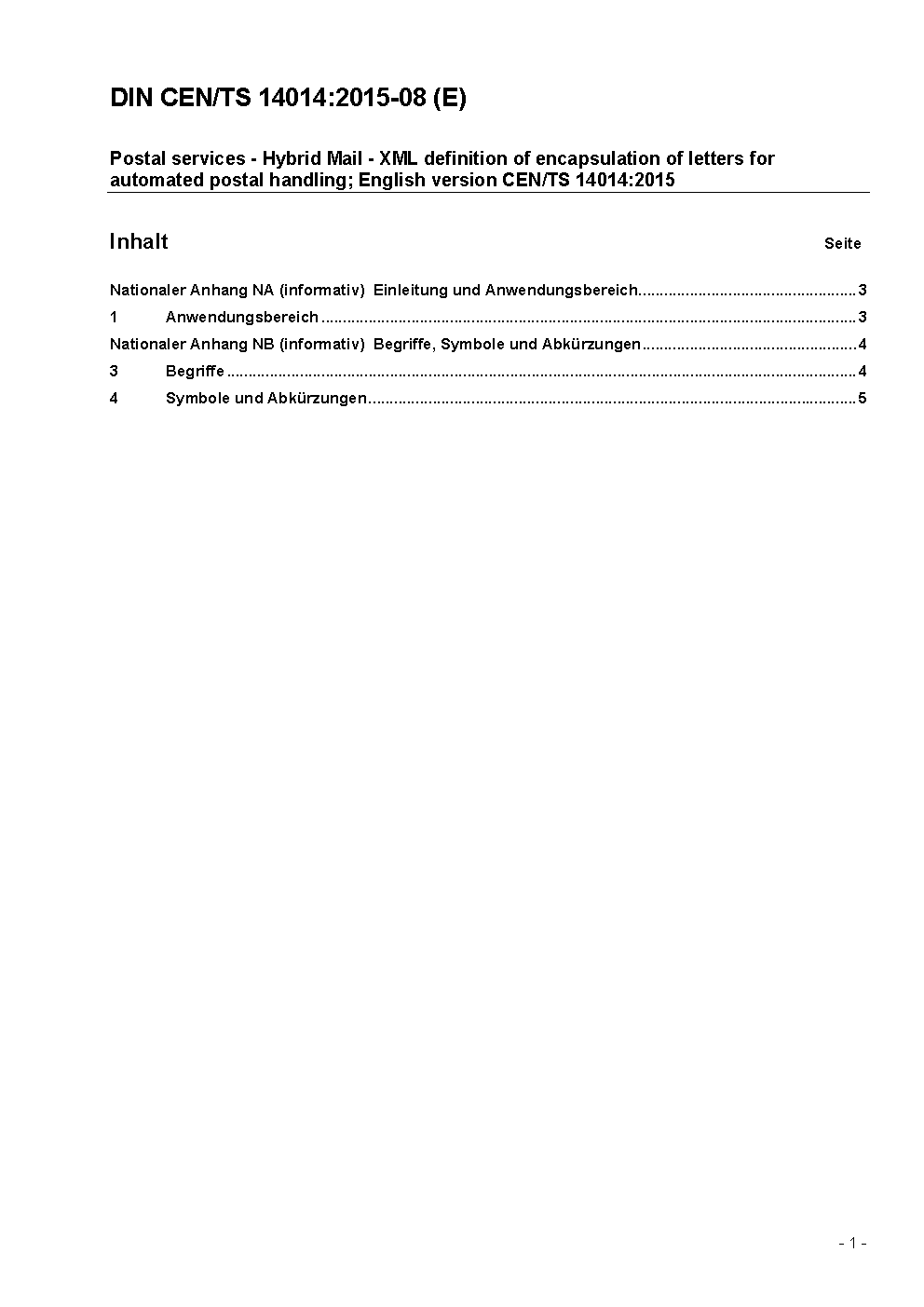 Postalische Dienstleistungen - Hybrid mail - XML-Definition für die Verkapselung von Briefen zur automatischen Postbearbeitung; Englische Fassung CEN/TS 14014:2015