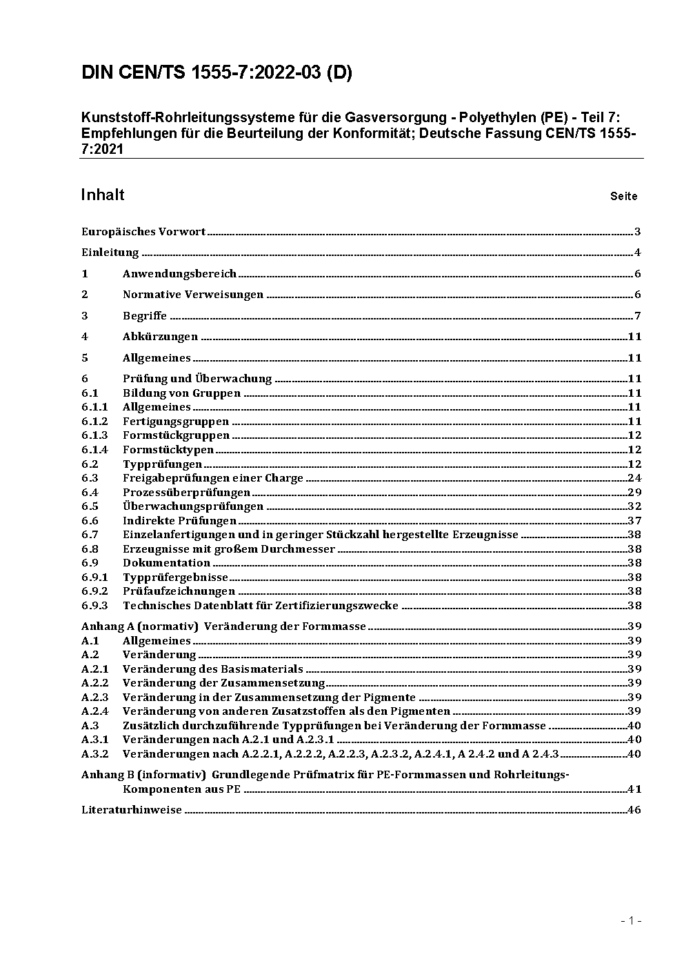 Plastics piping systems for the supply of gaseous fuels - Polyethylene (PE) - Part 7: Guidance for the assessment of conformity; German version CEN/TS 1555-7:2003