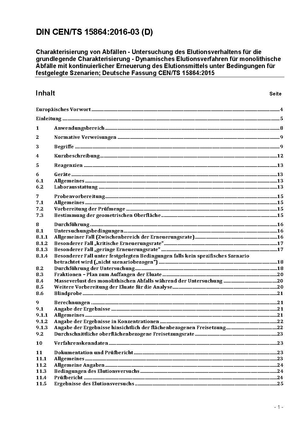 Charakterisierung von Abfällen - Untersuchung des Auslaugungsverhaltens für die grundlegende Charakterisierung - Dynamisches Auslaugungsverfahren für monolithische Abfälle mit kontinuierlicher Erneuerung des Auslaugungsmittels unter Bedingungen für festgelegte Szenarien; Deutsche Fassung CEN/TS 15864:2012
