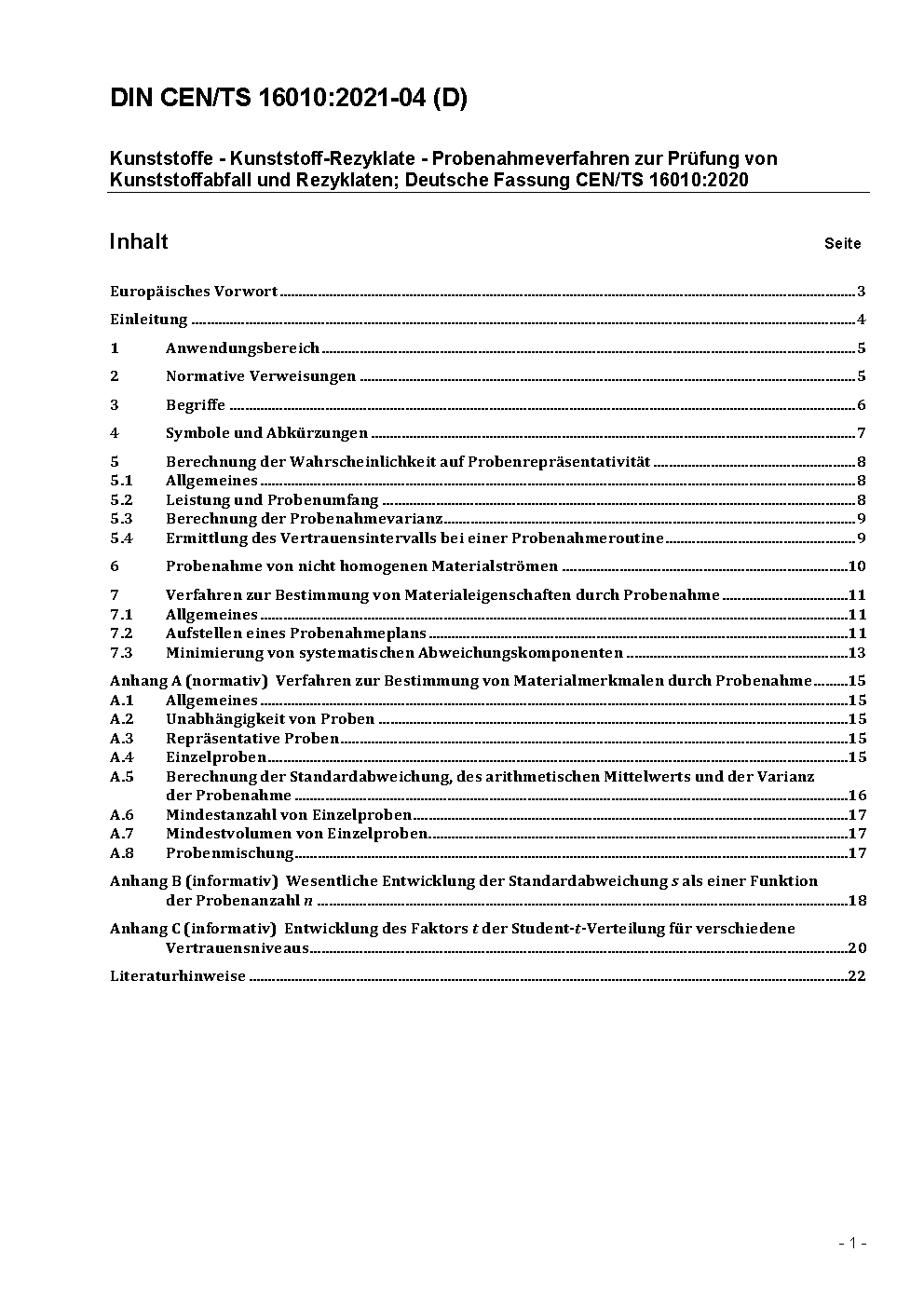 Kunststoffe - Kunststoff-Rezyklate - Probenahmeverfahren zur Prüfung von Kunststoffabfall und Rezyklaten; Deutsche Fassung CEN/TS 16010:2020