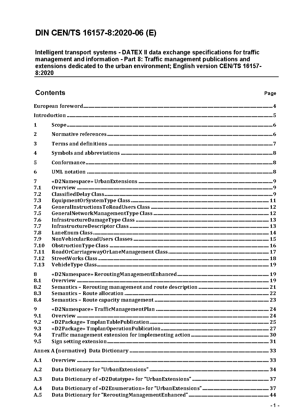 Intelligent transport systems - DATEX II data exchange specifications for traffic management and information - Part 8: Traffic management publications and extensions dedicated to the urban environment; English version CEN/TS 16157-8:2020