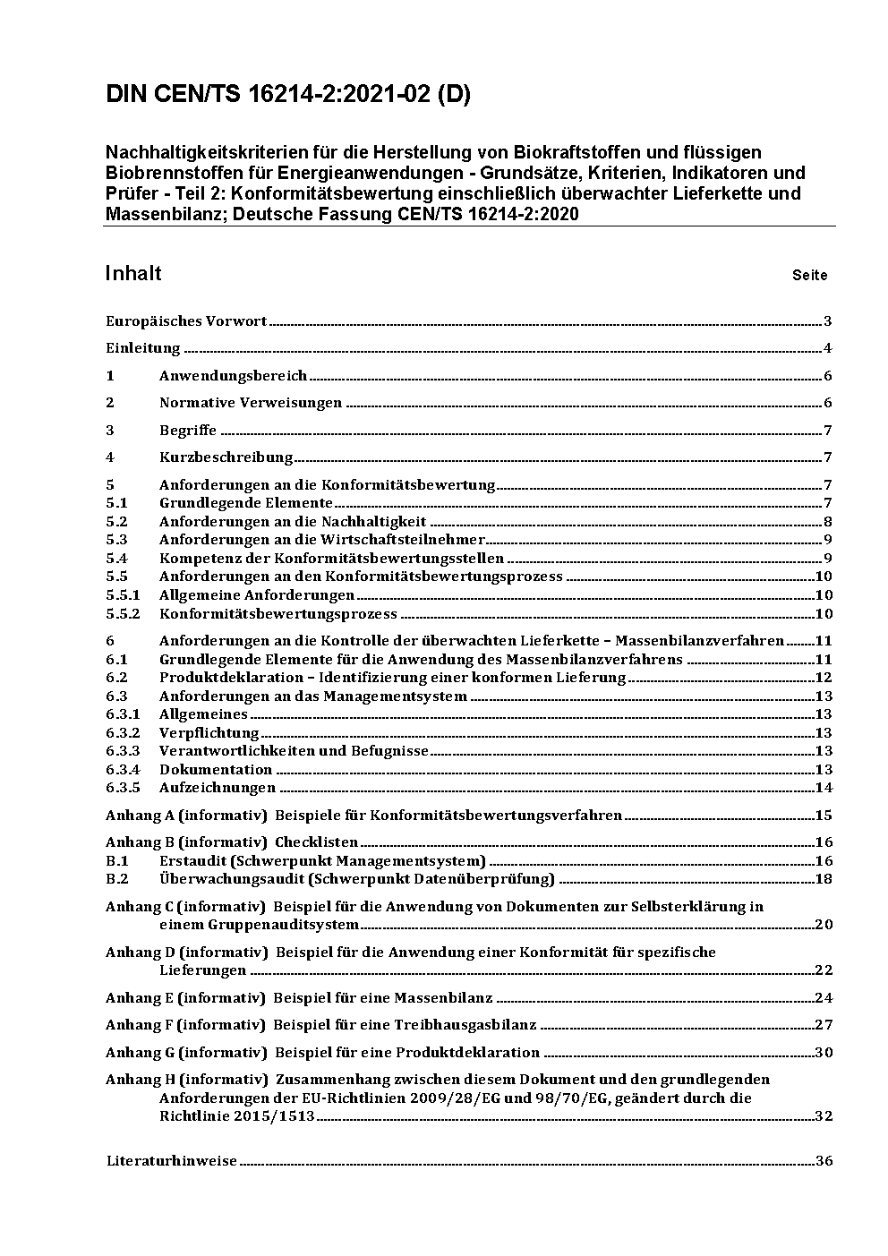 Sustainability criteria for the production of biofuels and bioliquids for energy applications - Principles, criteria, indicators and verifiers - Part 2: Conformity assessment including chain of custody and mass balance; German version CEN/TS 16214-2:2020