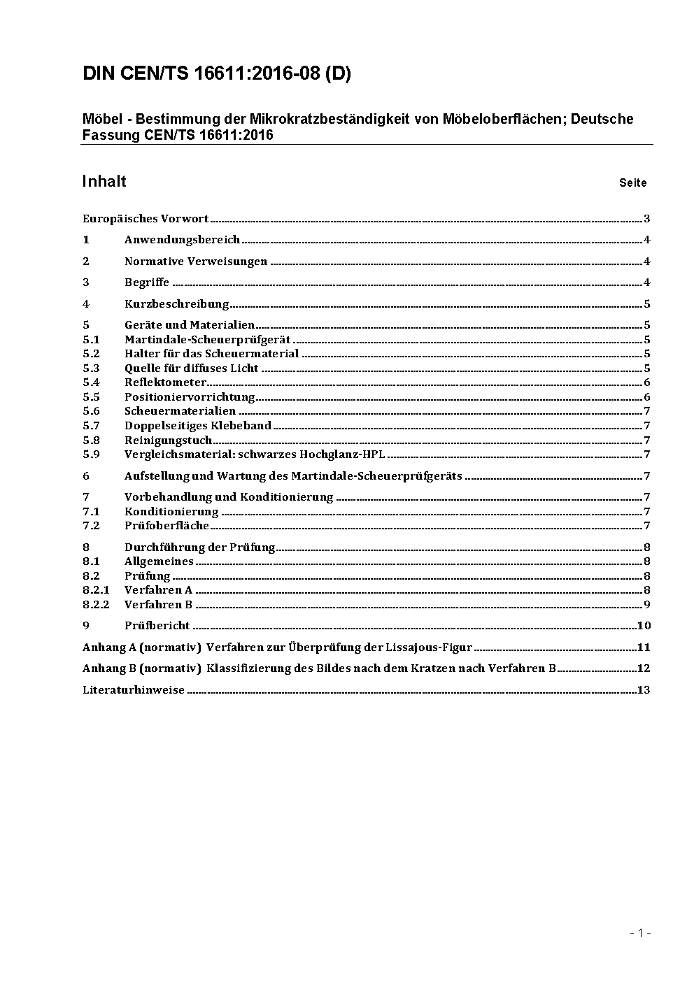 Möbel - Bestimmung der Mikrokratzbeständigkeit von Möbeloberflächen; Deutsche Fassung CEN/TS 16611:2014
