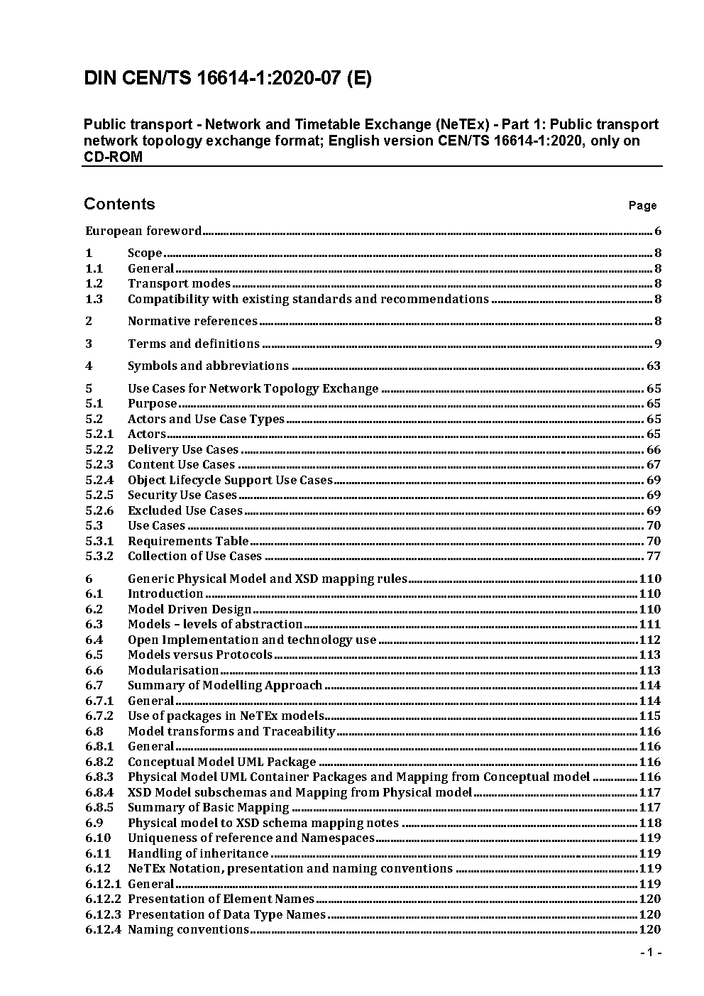 Public transport - Network and Timetable Exchange (NeTEx) - Part 1: Public transport network topology exchange format; English version CEN/TS 16614-1:2020, only on CD-ROM.