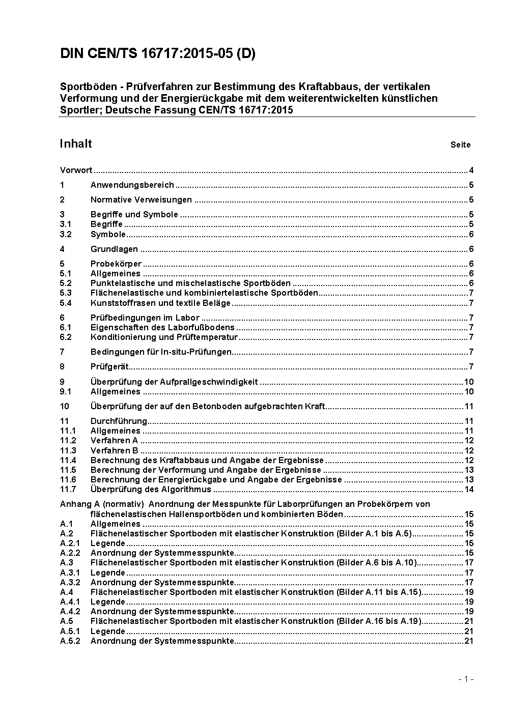 Sportböden - Prüfverfahren zur Bestimmung des Kraftabbaus, der vertikalen Verformung und der Energierückgabe mit dem weiterentwickelten künstlichen Sportler; Deutsche Fassung CEN/TS 16717:2015