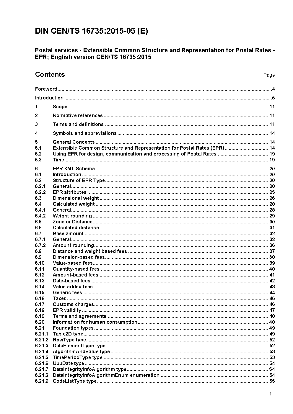 Postal services - Extensible Common Structure and Representation for Postal Rates - EPR; English version CEN/TS 16735:2015