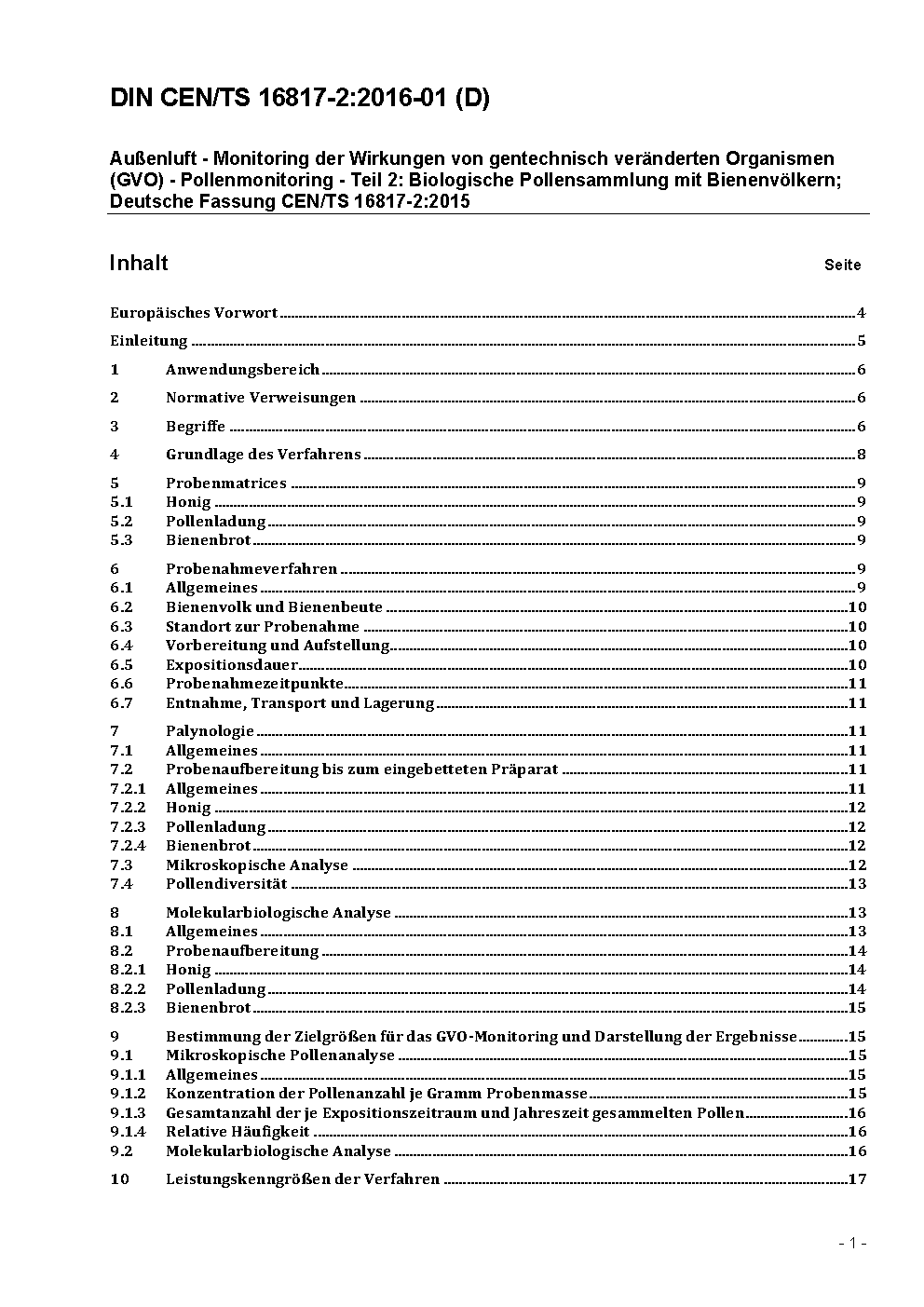 Außenluft - Monitoring der Wirkungen von gentechnisch veränderten Organismen (GVO) - Pollenmonitoring - Teil 2: Biologische Pollensammlung mit Bienenvölkern; Deutsche Fassung CEN/TS 16817-2:2015