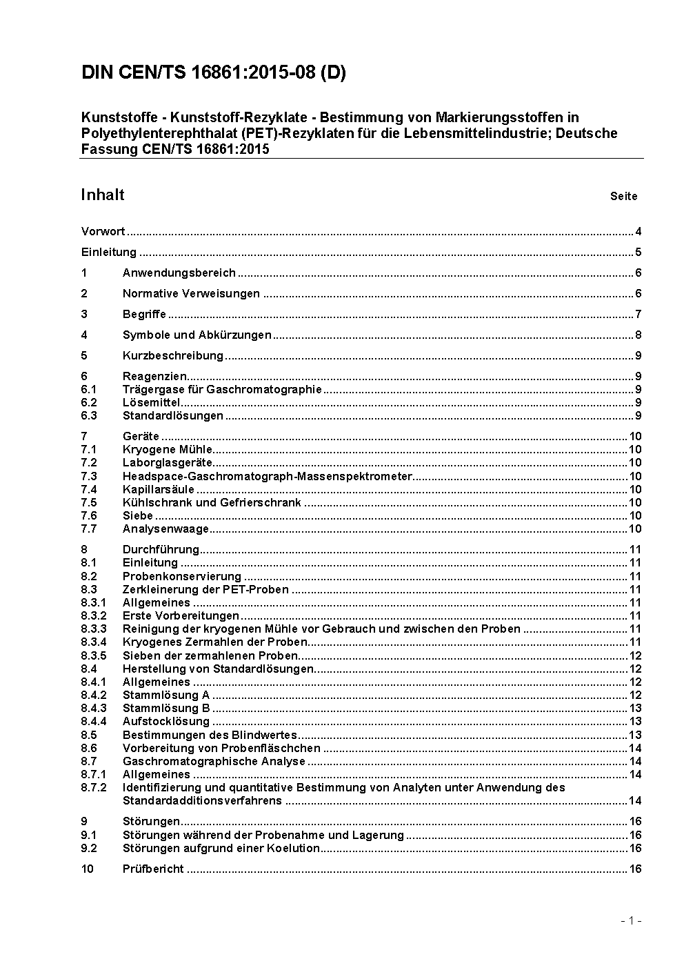 Kunststoffe - Kunststoff-Rezyklate - Bestimmung von Markierungsstoffen in Polyethylenterephthalat (PET)-Rezyklaten für die Lebensmittelindustrie; Deutsche Fassung CEN/TS 16861:2015