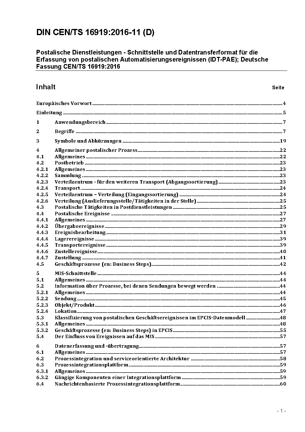 Postalische Dienstleistungen - Schnittstelle und Datentransferformat für die Erfassung von postalischen Automatisierungsereignissen (IDT-PAE); Deutsche Fassung CEN/TS 16919:2016