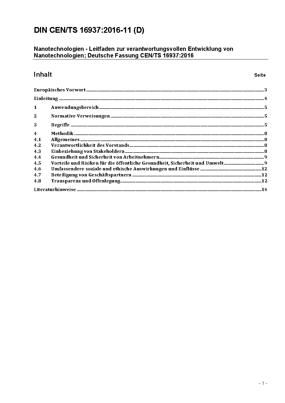 Nanotechnologien - Leitfaden zur verantwortungsvollen Entwicklung von Nanotechnologien; Deutsche Fassung CEN/TS 16937:2016