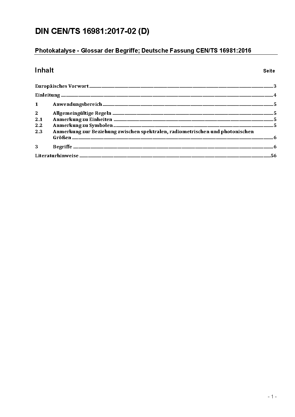 Photokatalyse - Glossar der Begriffe; Deutsche Fassung CEN/TS 16981:2016